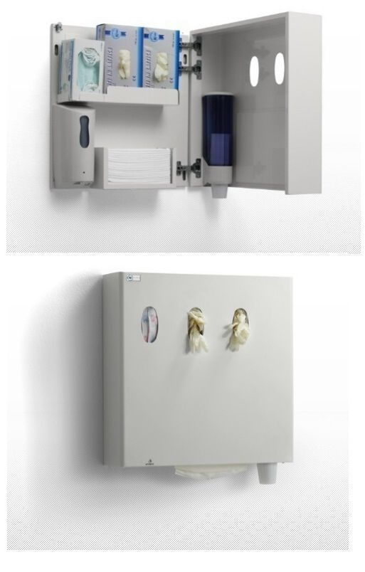 Hygeniewandschrank Diese Wandeinheit wurde entwickelt, um dem Bedürfnis zu entsprechen alle hygienischen Einwegprodukte in einem funktionellen Schrank kombinieren. Es ist mit praktischen Raffinessen ausgestattet. Sie können Ihre Handschuhe, Trinkbecher, Seife, Mundschutz und Servietten bequem erreic