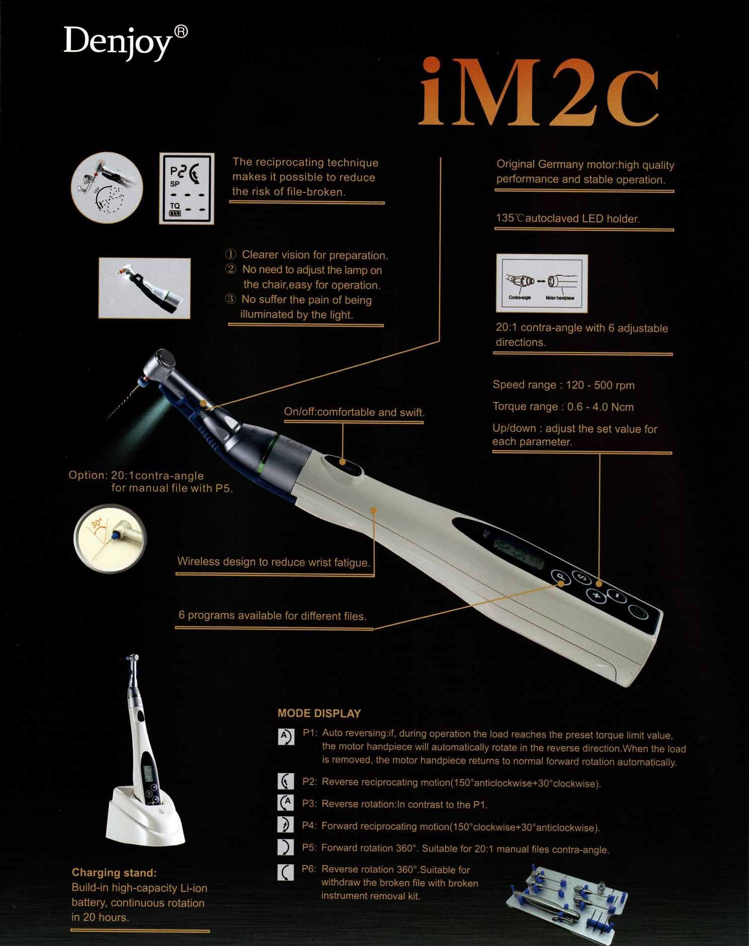 Dentalmaterialien der Firma Dental Südheide GmbH -Drehmomentbegrenzung -Drehmomentkontrolle -Drehzahl 120-500 U min -Drehmoment 0,6-4,0 Ncm -9 Programme -Automatischer Vor- und Rücklauf -Reziproker Modus -Langlebiger Li-Ion Akku -Batteriekapazität 1050 mAh -Gesamtgewicht 140g