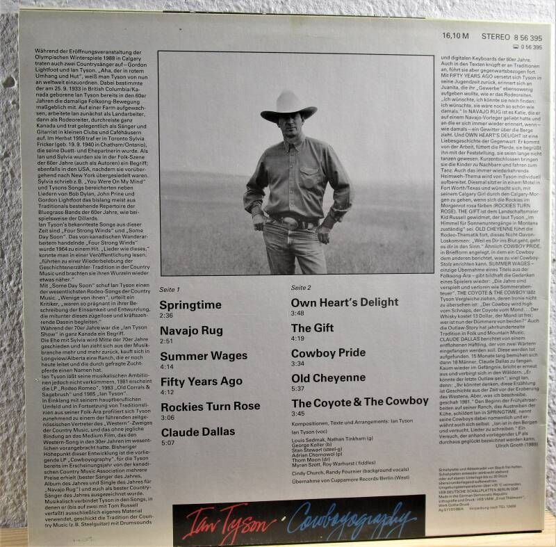 Ian Tyson - Cowboyography Amiga 8 56 395 1988 Vinyl: VG++ Cover: VG++ A1 Springtime 2:36 A2 Navajo Rug 2:51 A3 Summer Wages 4:14 A4 Fifty Years ago 4:12 A5 Rockies turn Rose 3:06 A6 Claude Dallas 5:07 B1 Own Heart's Delight 3:48 B2 The Gift 4:19 B3 Cowboy Pride 3:34 B4 Old Cheyenne 5:37 B5 The Coyot