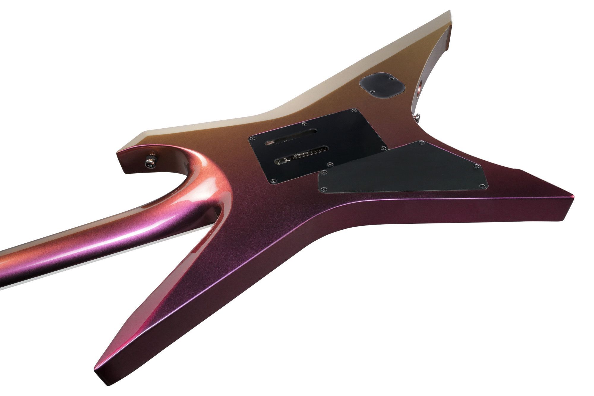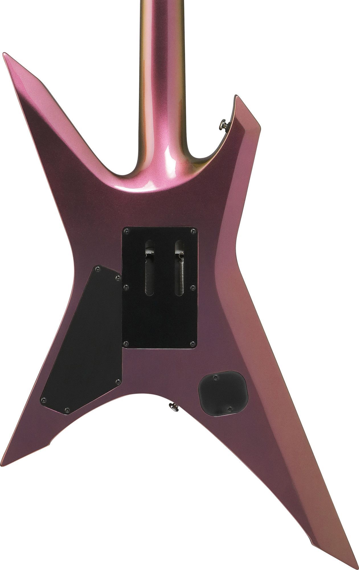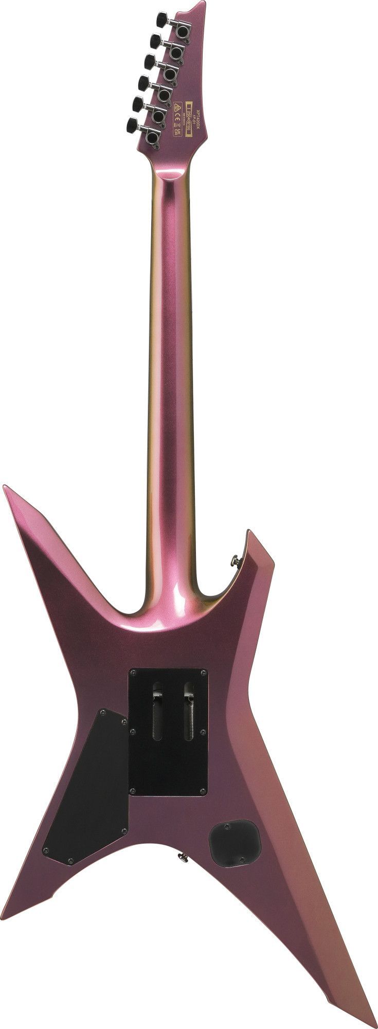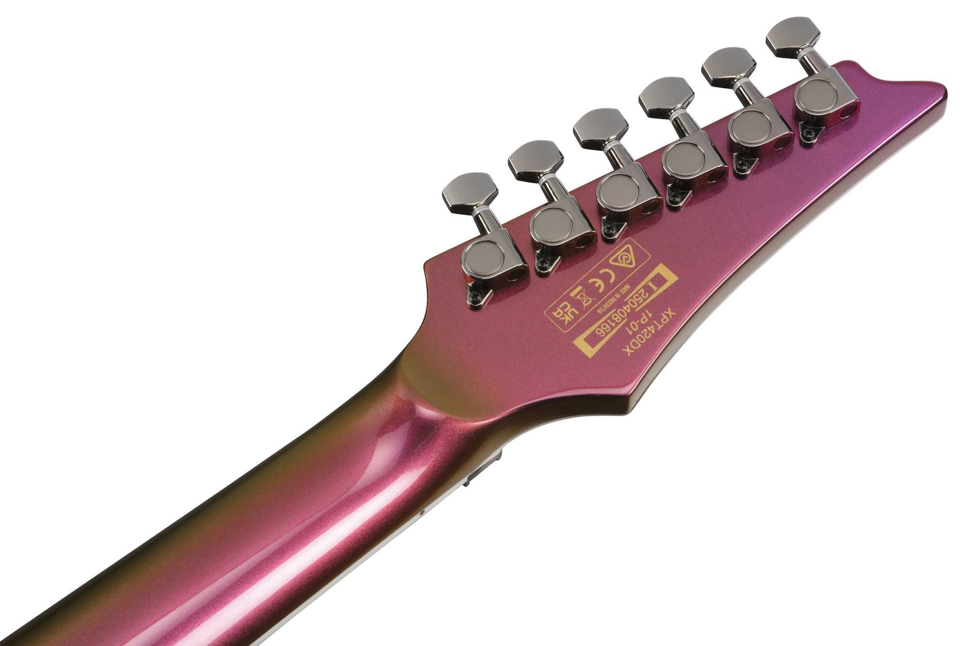 Ibanez XPT420DX - Rose Gold Chameleon Korpus: Okoume Hals: Fünfteilig Ahorn Walnuss Halsprofil: Wizard III Griffbrett: Palisander Mensur: 25,5'' (648 mm) Sattelbreite: 43 mm Bünde: 24 Jumbo Bünde Tonabnehmer: 2 x Quantum Regler: Volume, Tone, 5-Wege Schalter Brücke: Edge Zero II Mechaniken: Ibanez M