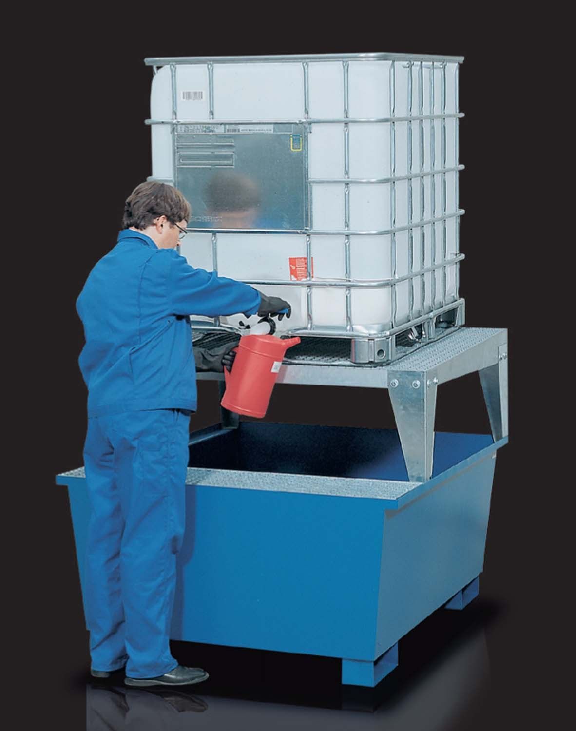 IBC Auffangwanne aus Stahl mit Abfüllbock lackiert blau Abfüllstation
