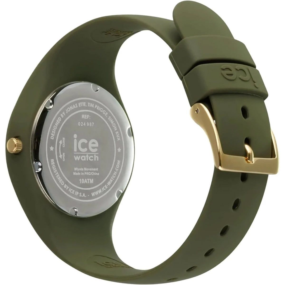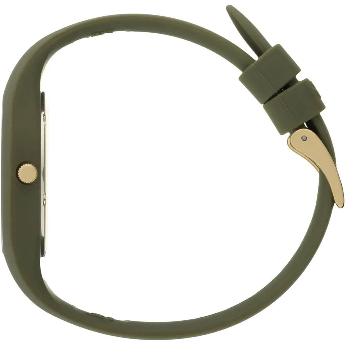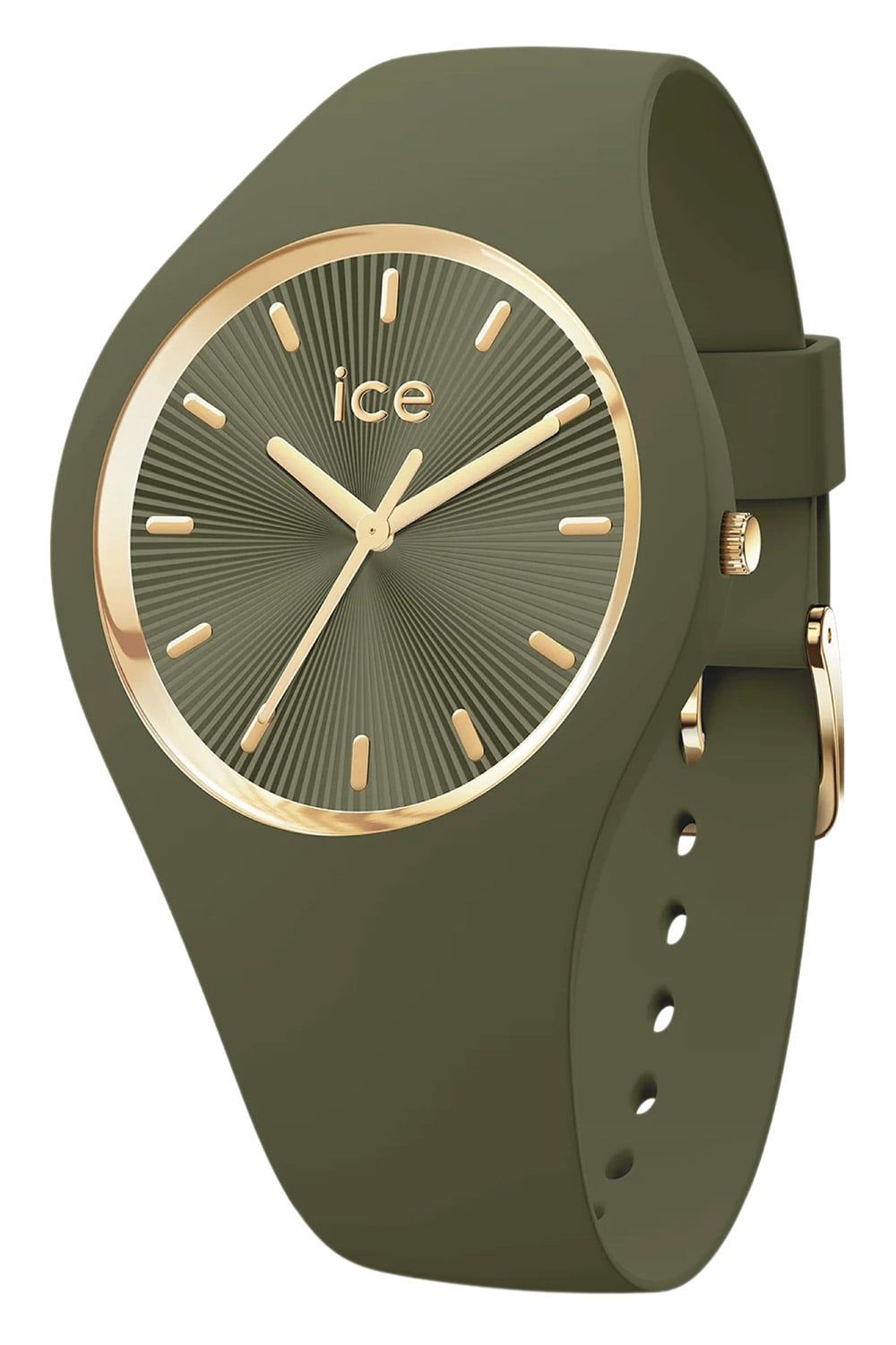 feine Armbanduhr für Frauen, aus der "ICE champagne"-Kollektion, präzises Quarzwerk, olivgrünes Zifferblatt mit strahlenförmiger Musterung, goldfarben umrandet, goldfarbene Zeiger und Indizes, zentraler Sekundenzeiger, olivgrünes Silikon-Gehäuse in das Armband integriert, verschraubter Edelstahl-Gehäuseboden, geriffelte Krone, olivgrünes Silikonband mit Dornschließe, kratzunempfindliches Mineralglas, wasserdicht bis 10 bar, Breite (ohne Krone) 40 mm, Höhe 9 mm