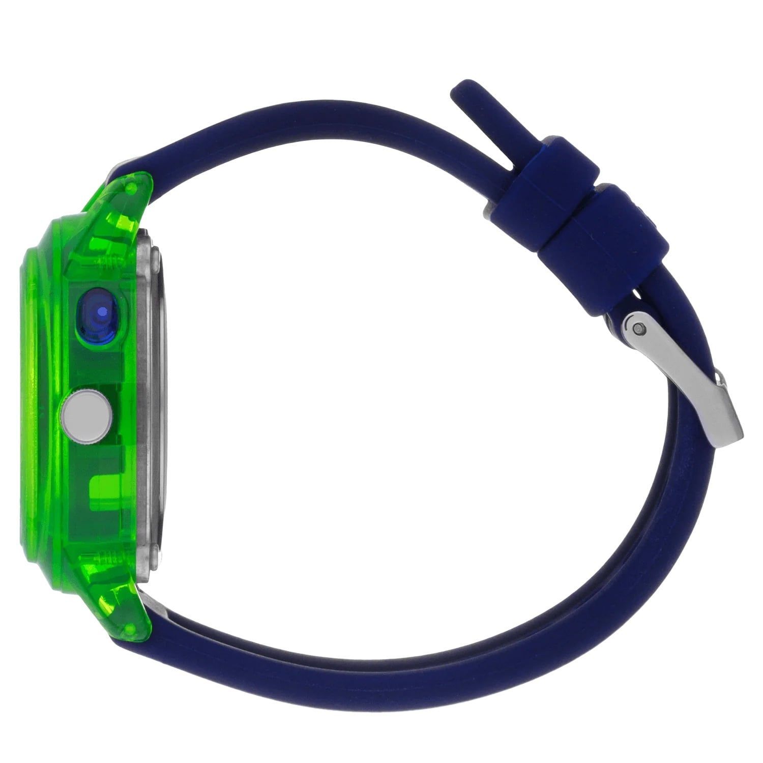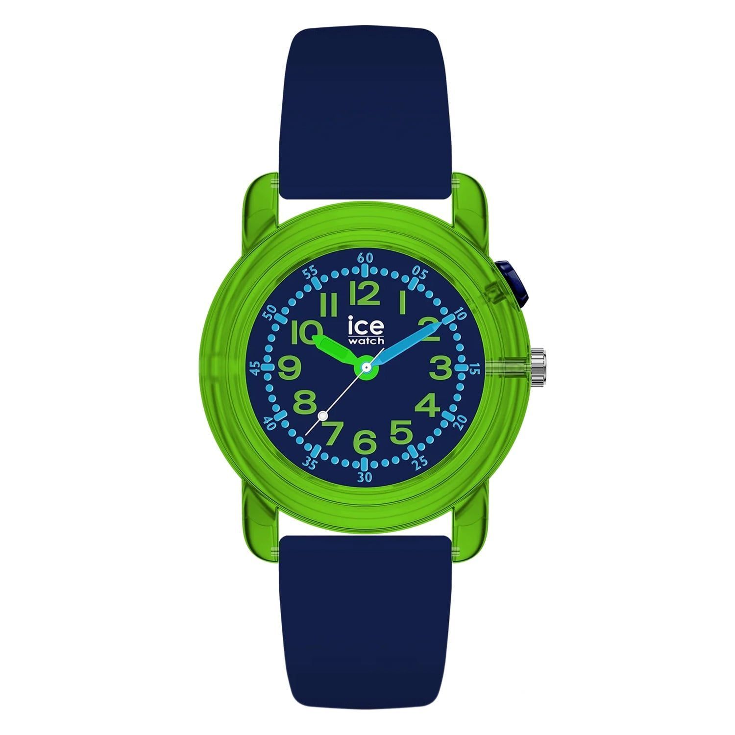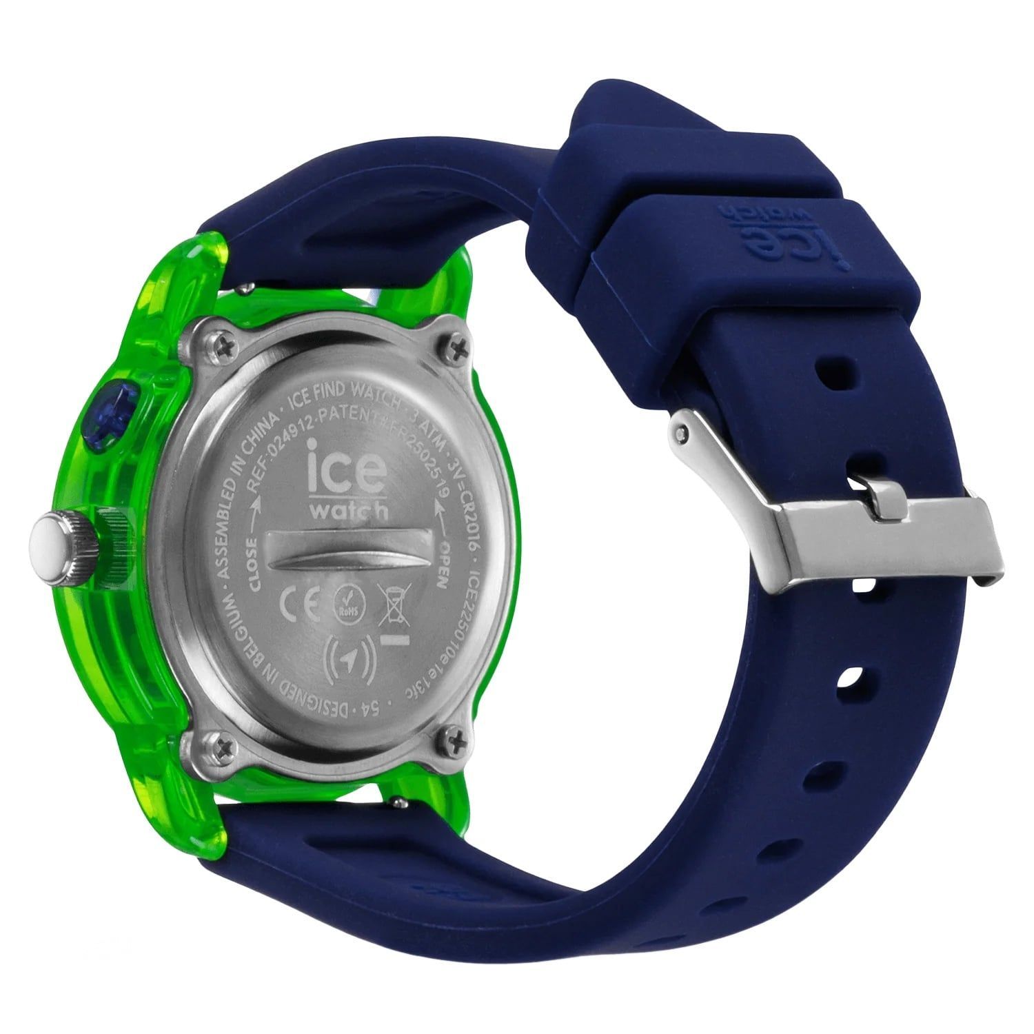 trendige Uhr für Kinder und Jugendliche, aus der "ICE find" Kollektion, präzises Quarzwerk, eine geolokalisierbare Uhr mit integrierter Apple Wo Ist?-Technologie, kann über ein verknüpftes iPhone einfach gefunden werden, wenn sie verloren oder vergessen wird, dunkelblaues Zifferblatt, hellblauer und grüner Zeiger, grüne und hellblaue Zahlen, zentraler Sekundenzeiger, transparent grünes Kunststoff-Gehäuse, geschraubter Edelstahl-Gehäuseboden, geriffelte Krone, Kunststoffglas, dunkelblau