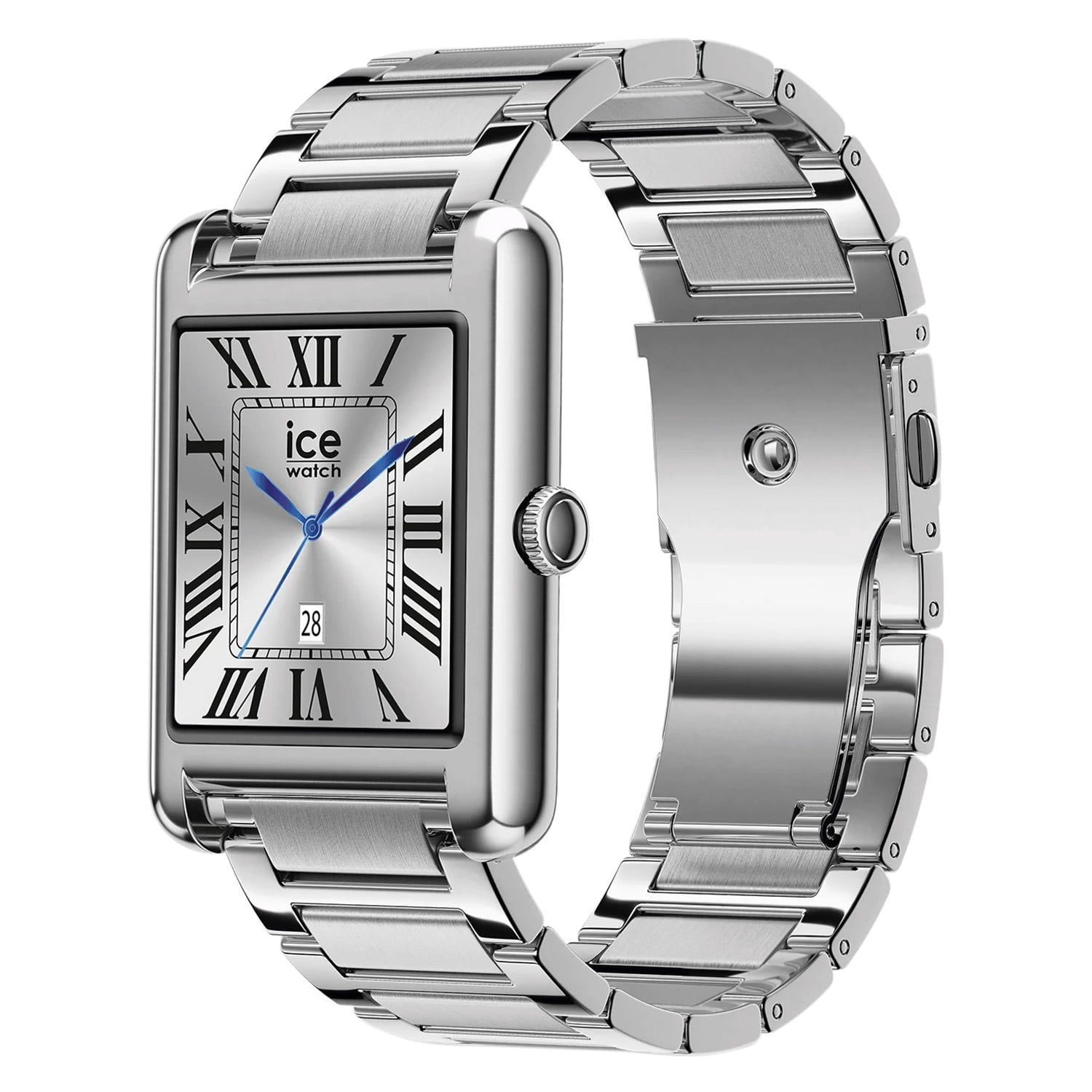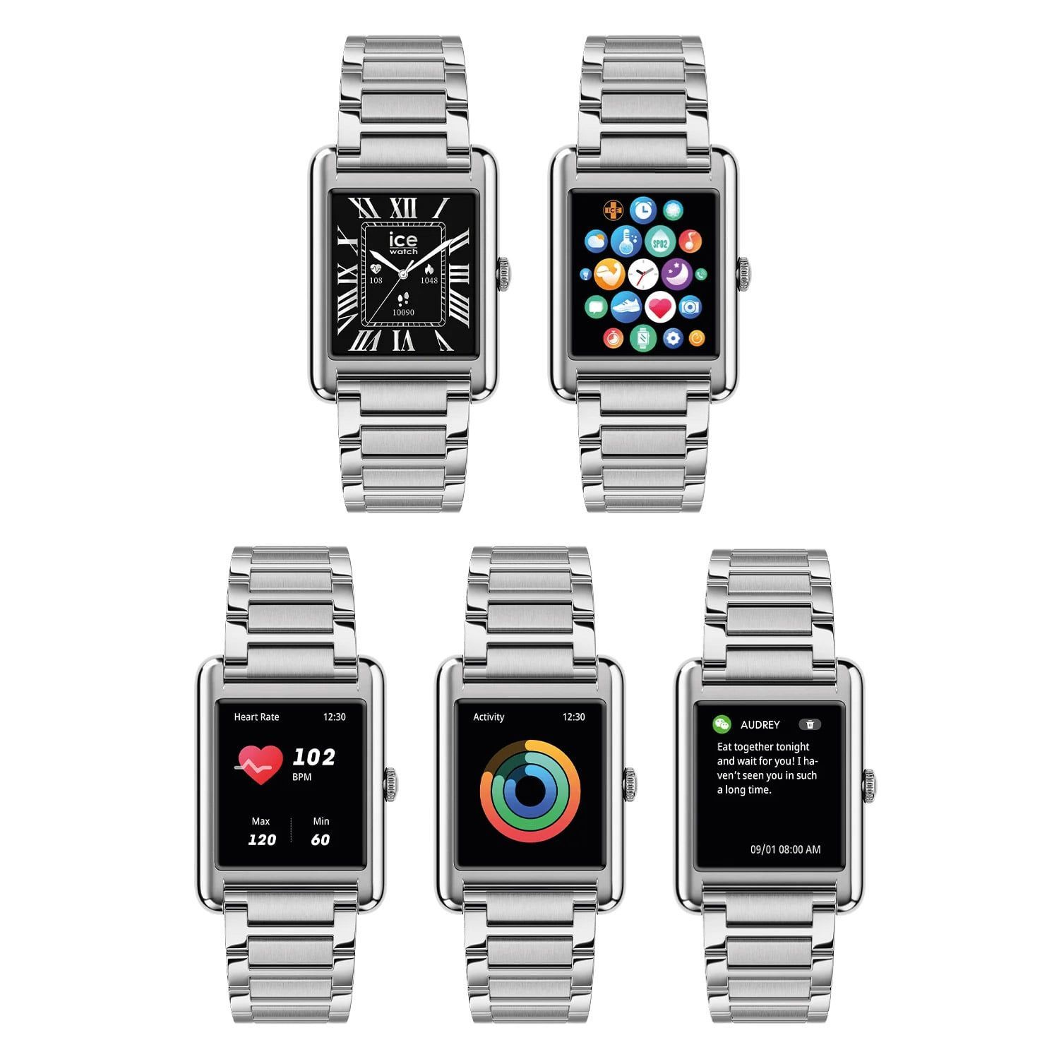 trendige Smartwatch aus der ICE smart TKS 2.0 rectangular 1.41 Kollektion, vielzählige smarte Funktionen über die ICE App und Bluetooth, AMOLED Display 32 x 36 mm (320 x 360 pixels), individuell einstellbares Zifferblatt, Anzeige von Uhrzeit, Datum und Wochentag, Stoppuhr, Timer und Alarm, Aufzeichnung der Schlafphasen, Sportfunktionen wie z. B. Aufzeichnen der Schritte, verbrauchte Kalorien, zeigt Benachrichtigungen des Smartphones, ICE Call Funktion für den Notfall, Anrufe per Bluetooth, Kamer