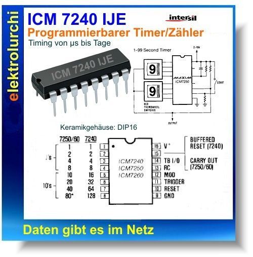 Sie bieten hier auf folgenden Artikel 1 Stück ICM7240 IJE - Programmierbarer Teiler Zähler DIP16, Intersil Original Intersil Bezeichnung: NE555 Gehäuseform: SO-8 Spannung: 4,5V - 16V DC Ausgangsstrom: max. + - 200mA Stromverbrauch: 3mA LOW OUT @ 5V 10mA LOW OUT @ 15V 2mA HIGH OUT @ 5V 9mA HIGH OUT @