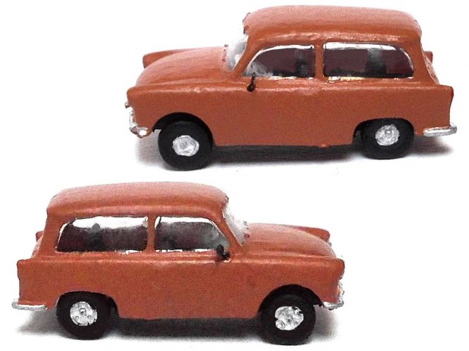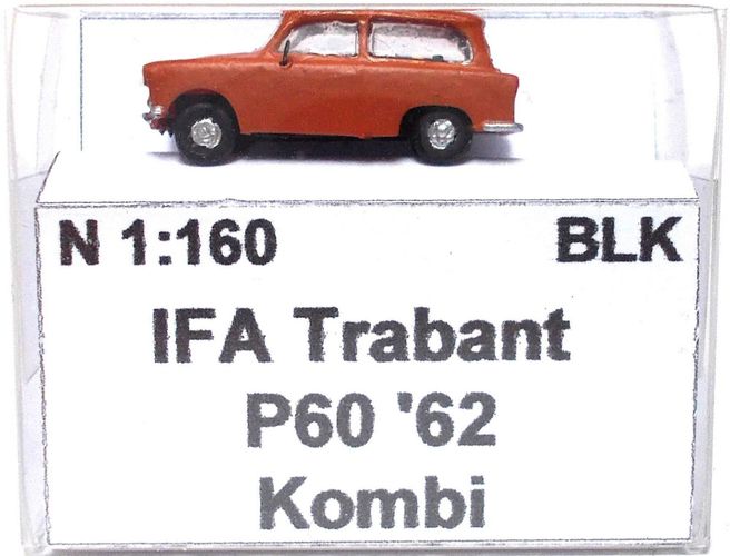 Die Bezahlung ist nur mit PayPal oder Barzahlung bei Abholung möglich, keine Banküberweisung !!! BLK Maßstab 1:160 neuwertiges Modell: IFA Trabant P60 '62, Kombi, braun Einsetzbar auf der Modellbahn ab Epoche III Das Modell wurde aus einem Kleinserien- 3D-Druck- Bausatz fertig gebaut, mit Airbrush n