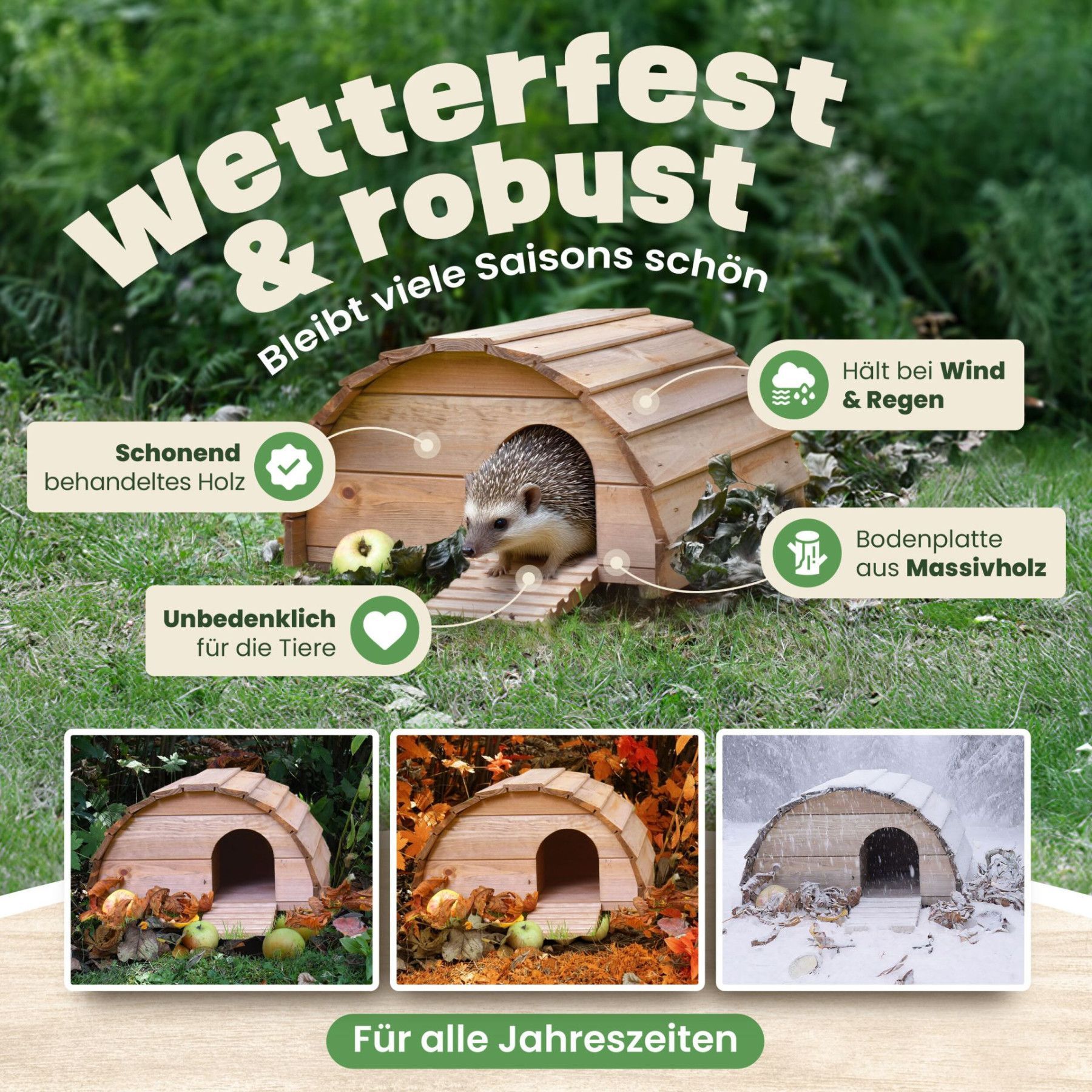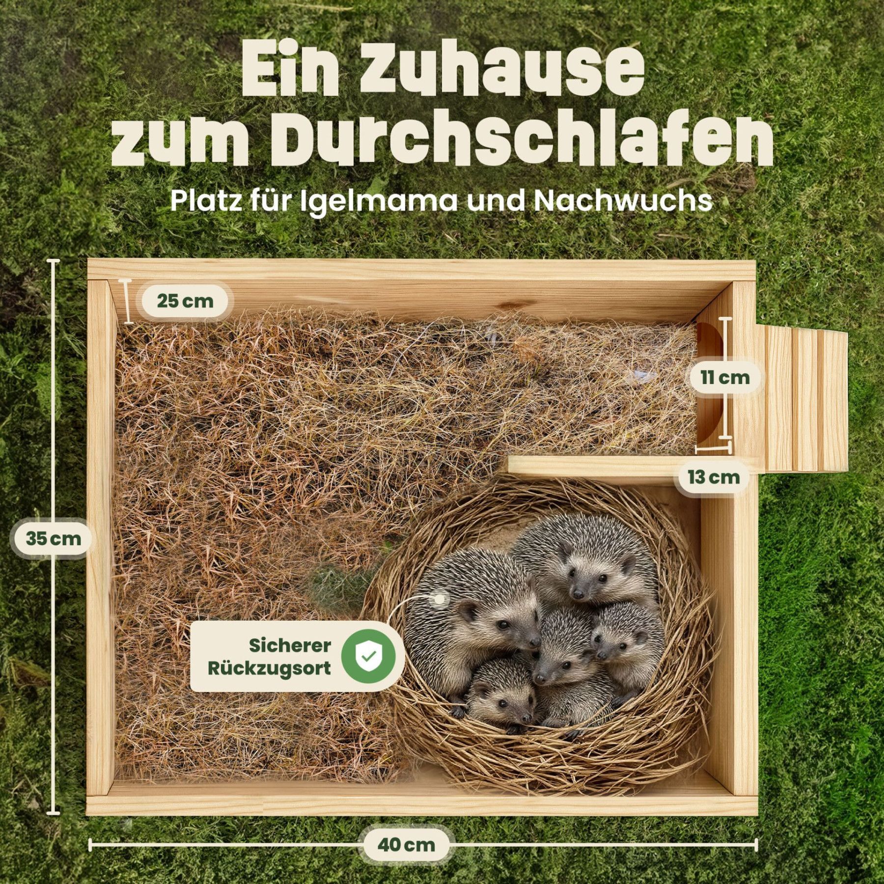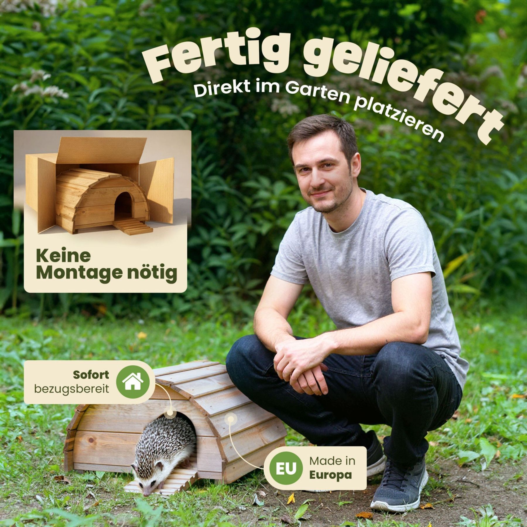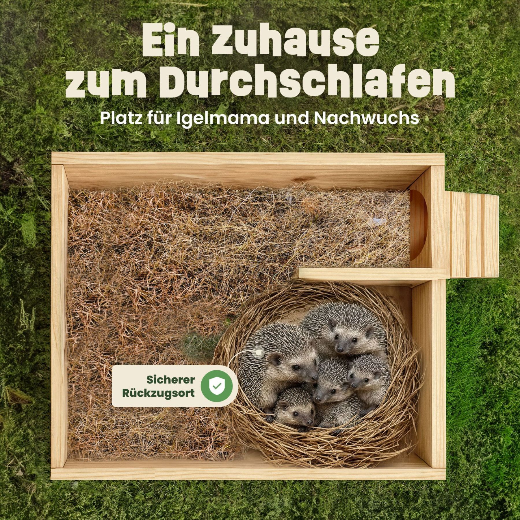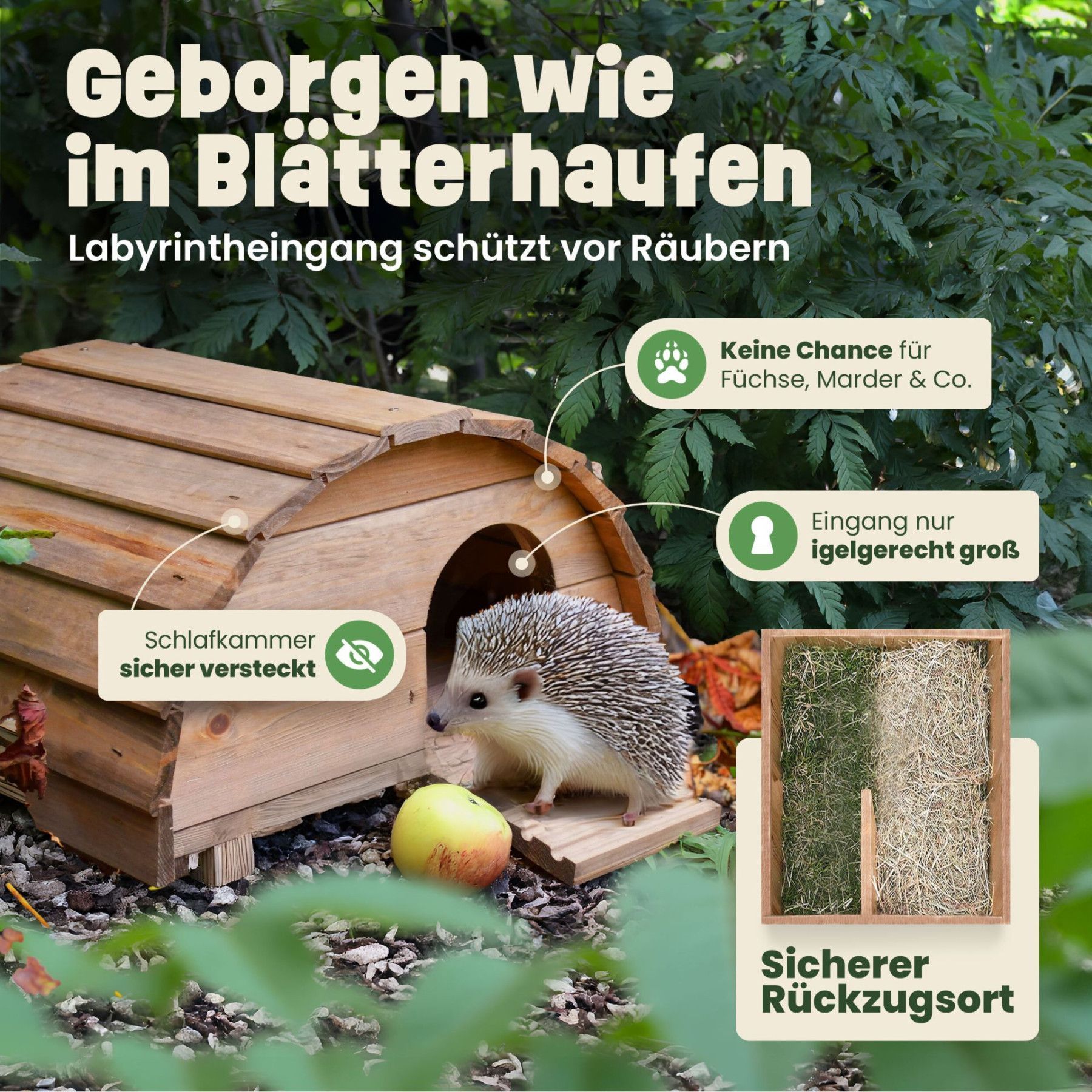 Igelhaus Manni Das Igelhaus Manni aus massivem Vollholz ist ein geschützter und wetterfester Rückzugsort für Igel im Garten. Mit Labyrintheingang, sicherer Schlafkammer und erhöhter Bodenplatte bietet es Schutz vor Fressfeinden, Kälte und Nässe. Es wird komplett montiert geliefert und ist sofort bez