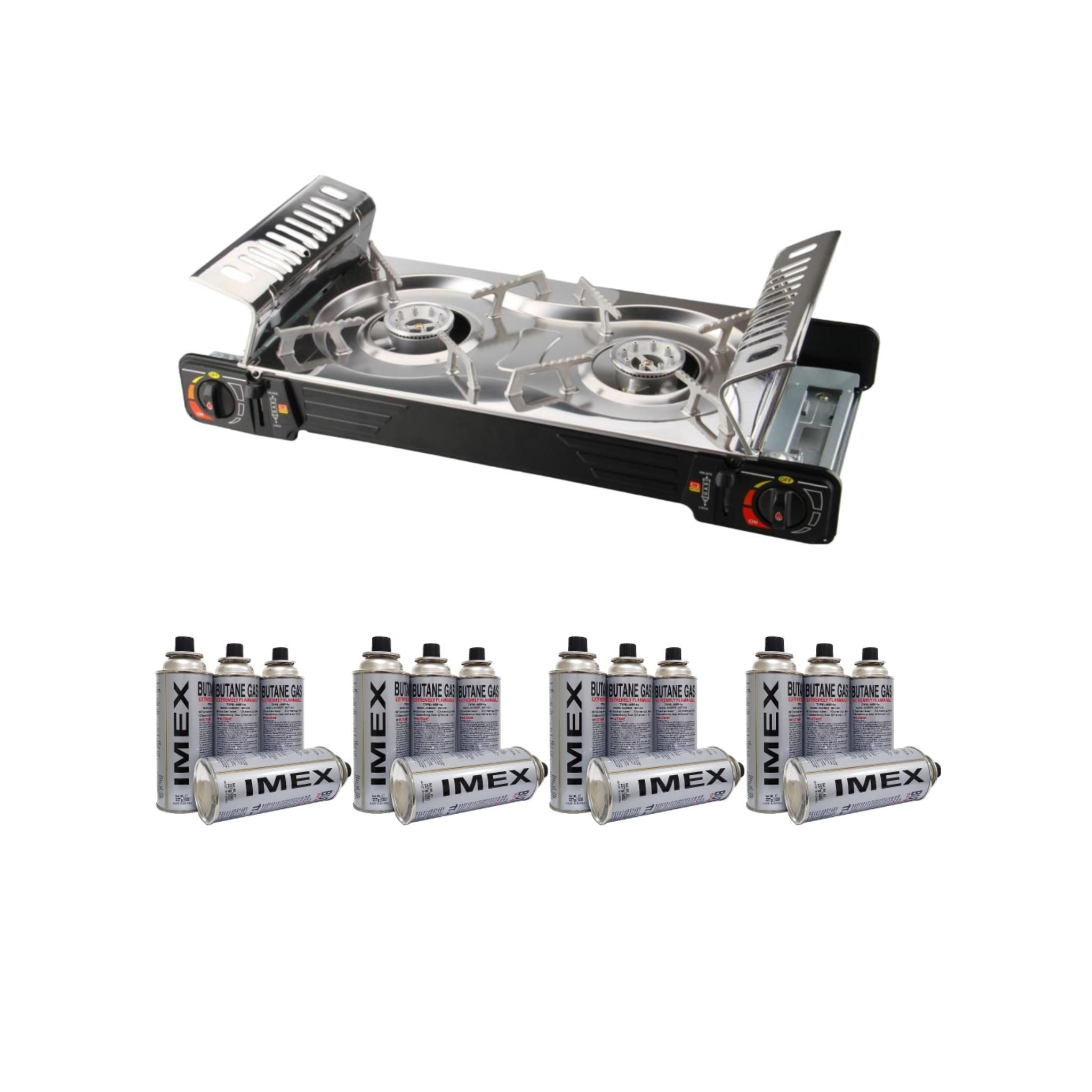 • IMEX BDZ-2x155 Edelstahl 2 Flammiger Outdoor Doppelgaskocher mit 12 Gaskartuschen