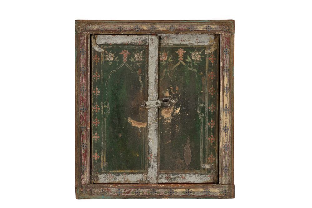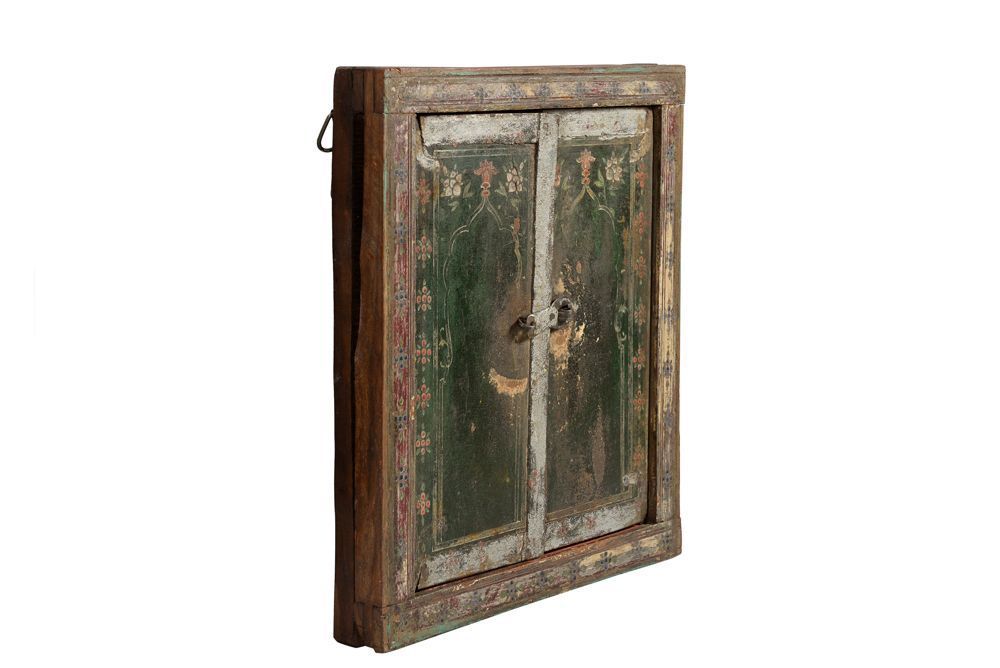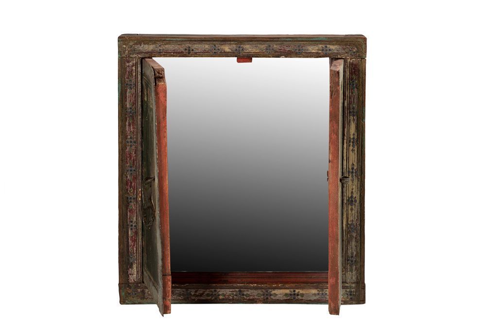 India 1950 kleiner Spiegel in antikem Fensterrahmen feine Bemalung Raj