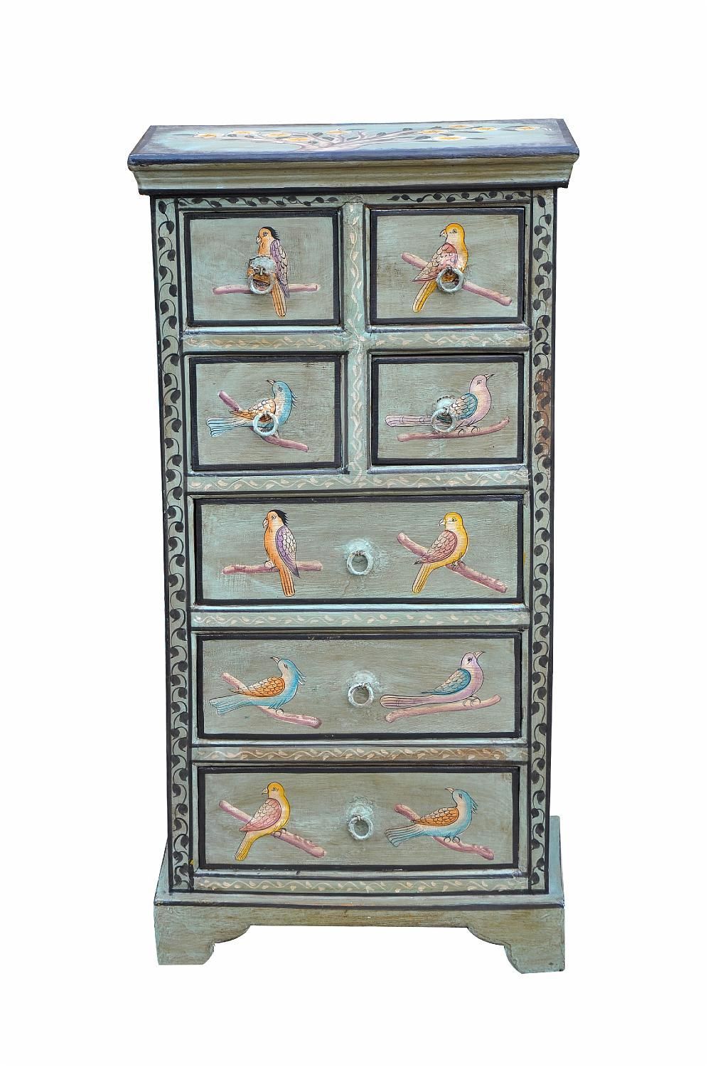 Indien Schubladenkommode Halbhoch âEuroEuro Zartblau Bemalt. Ein Meisterwerk der indischen Handwerkskunst. Diese halbhohe Schubladenkommode beeindruckt durch zarte Blautöne und vereint indische ßsthetik mit hoher Funktionalität.. Exquisites Design in zartem Blau. Die handbemalte Kommode in dezentem