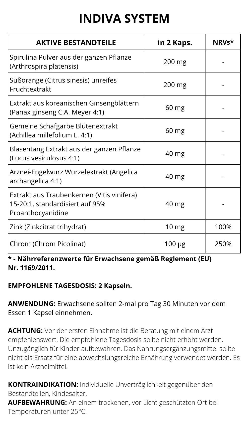 Indiva System Nahrungsergänzungsmittel für Damen und Herren. 30 kapseln