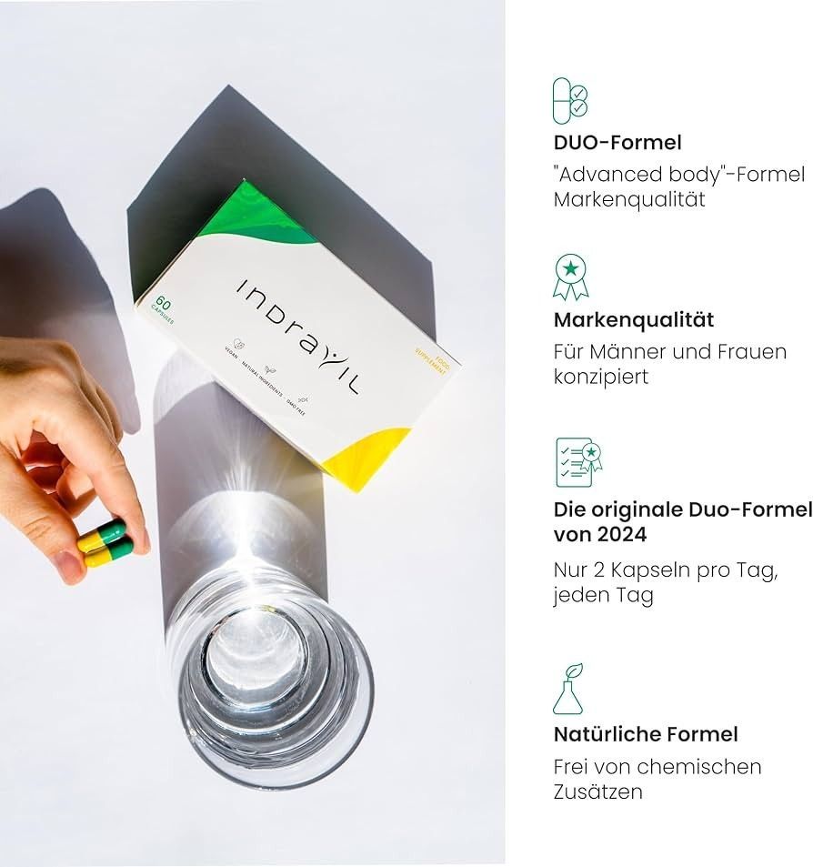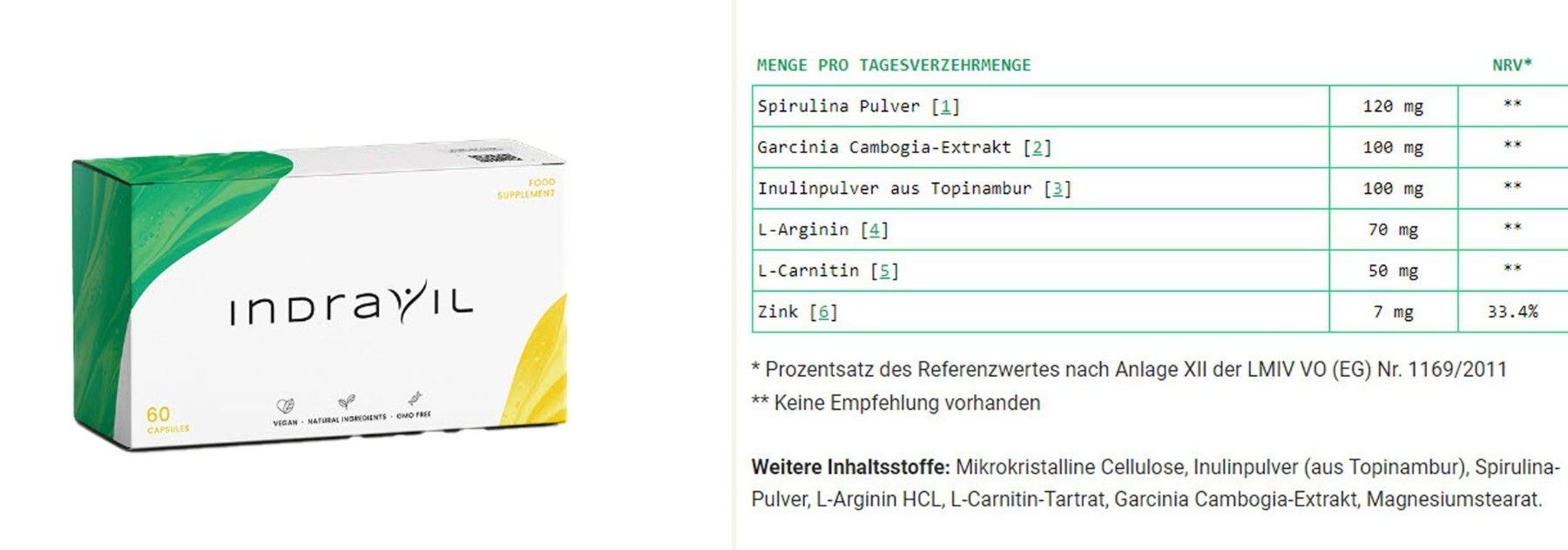 INDRAVIL Die Original 2024 DUO-Formel Unterstützung des Körpers mit Spirulina-Pulver, Inulin-Pulver, Garcinia Cambogia, L-Carnitin, L-Arginin & Zink, 60 Kapseln Nehme (2) Kapseln einmal (1x) täglich vor der Hauptmahlzeit (Mittag- oder Abendessen) ein. Trinke zwei (2) Gläser Wasser. Die empfohlene Tagesdosis sollte nicht überschritten werden. Um optimale Ergebnisse zu erzielen, empfehlen wir die Einnahme von zwei (2) Kapseln täglich.