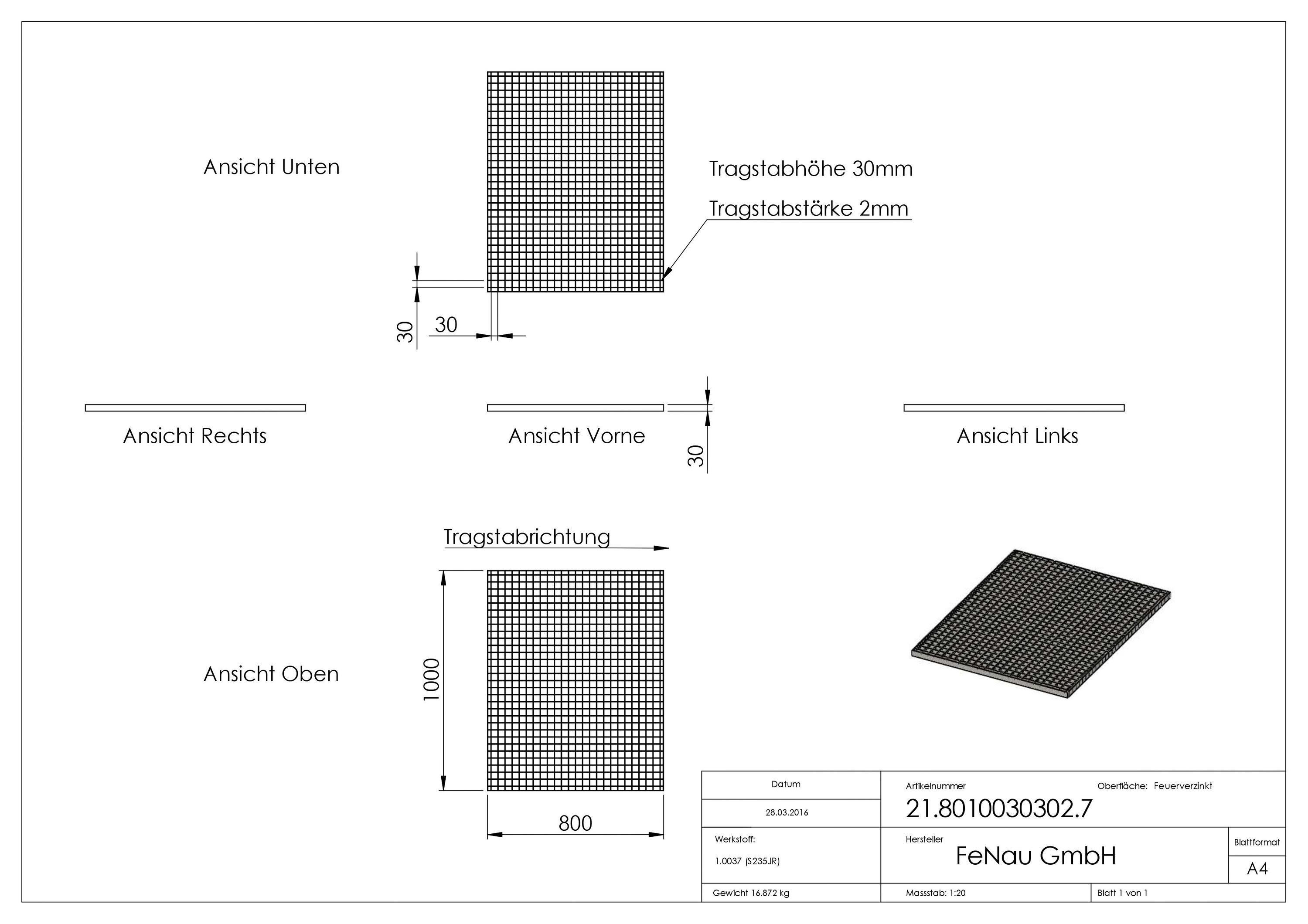 Industrie-Gitterrost | Maße: 800x1000x30 mm; MW 30/30 mm; 30/2 mm | S235JR (St37-2),