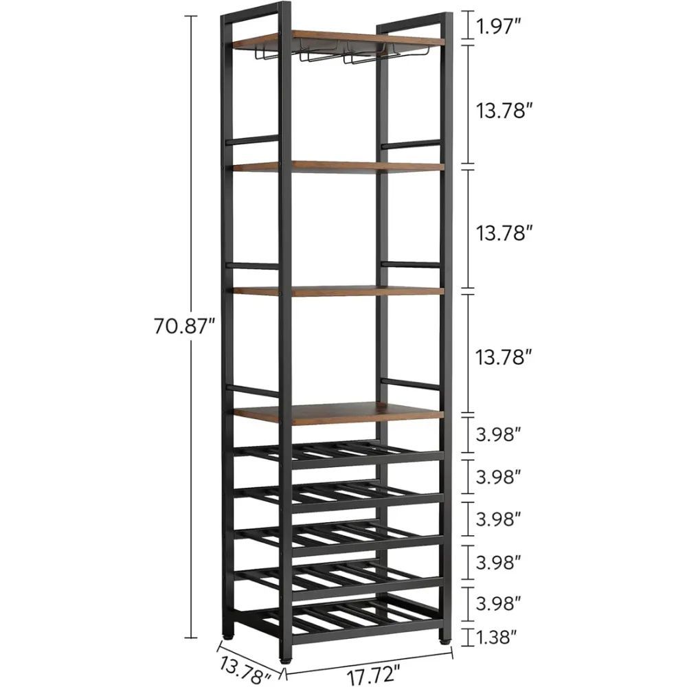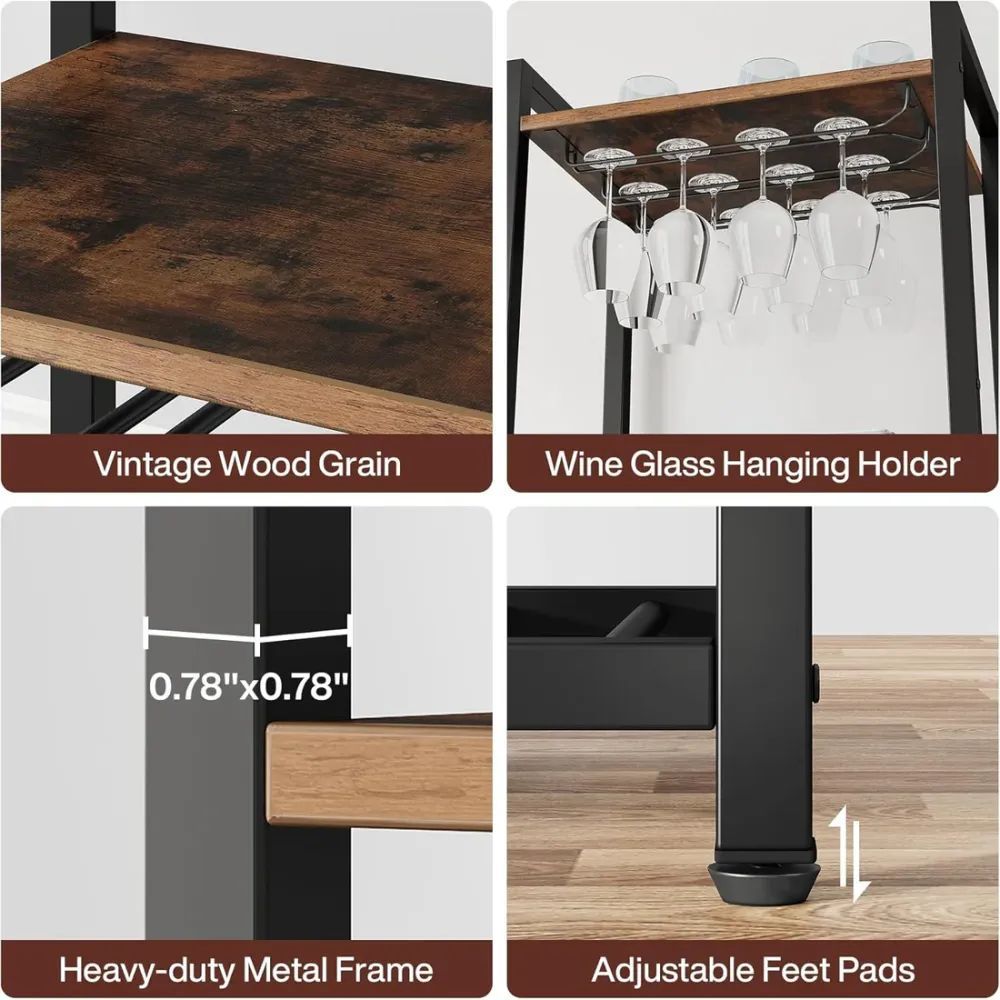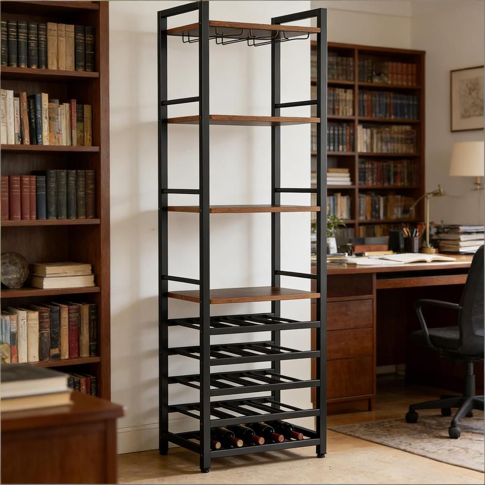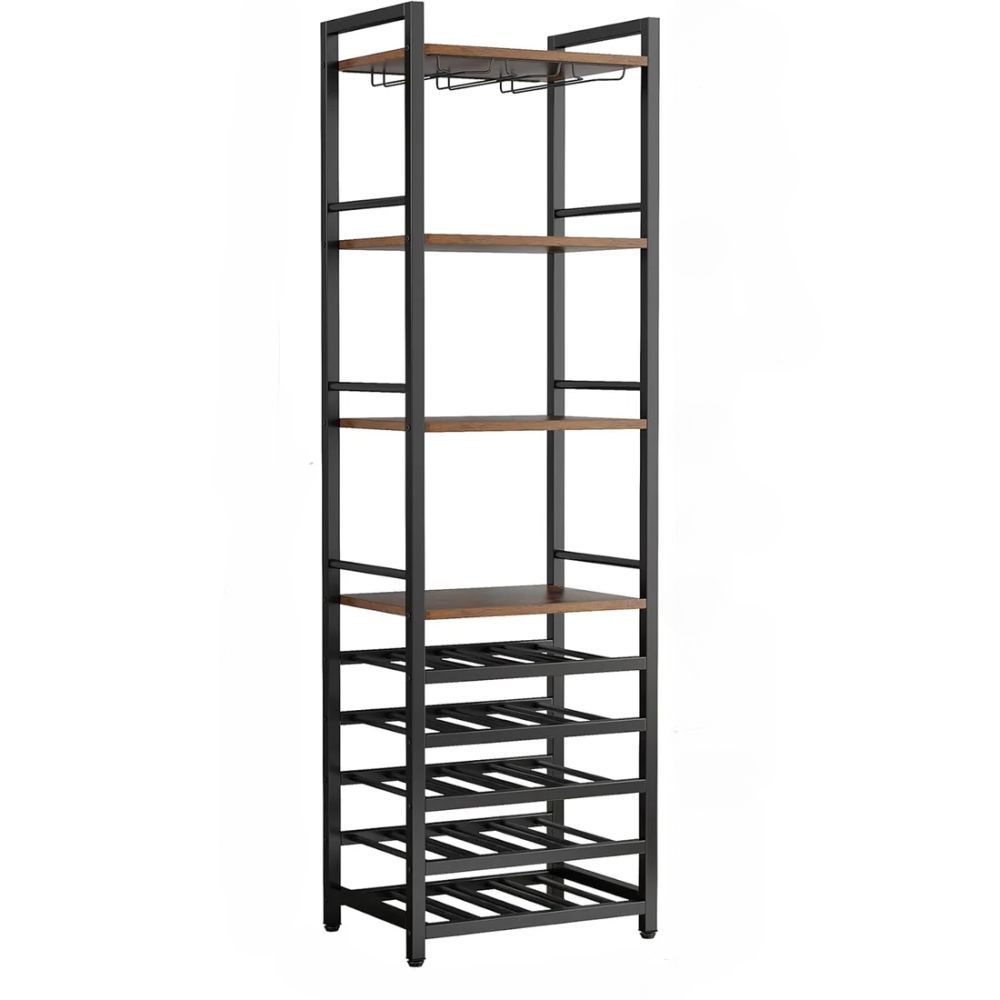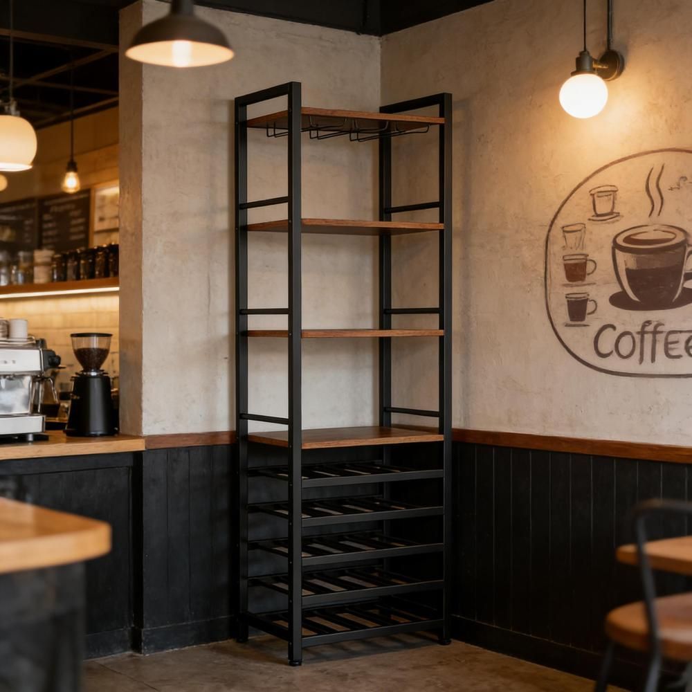 Das Wein-Bäerregal im industriellen Stil kombiniert Metall und Holz in mehrfarbigem Design. Es ist als Einzelprodukt ausgeführt und bietet integrierte Glashalter für eine praktische und dekorative Aufbewahrung.