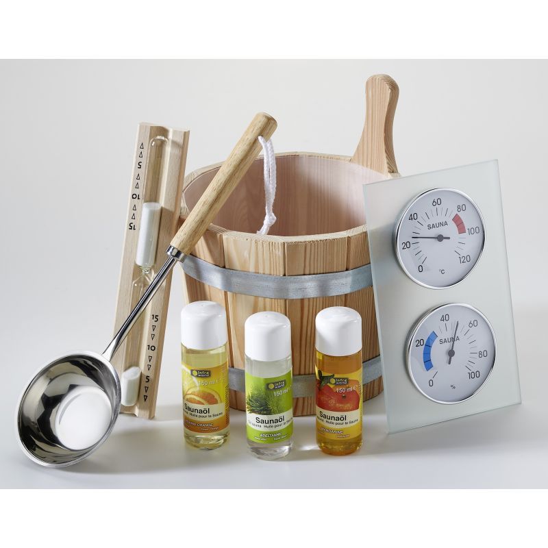 Infraworld 8 teiliges Saunaset Exklusiv Saunaöl Aufgusseimer Kelle Thermometer