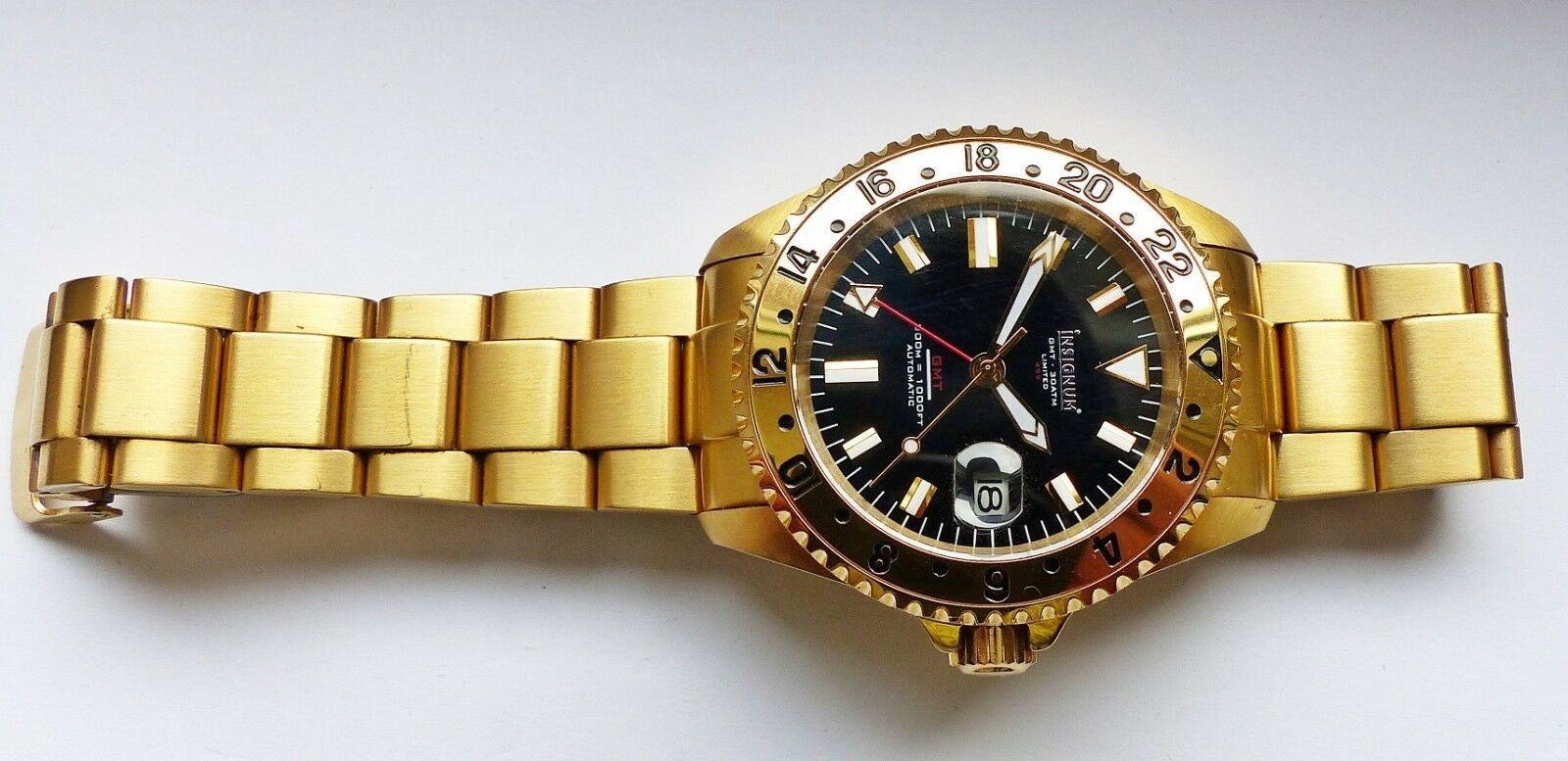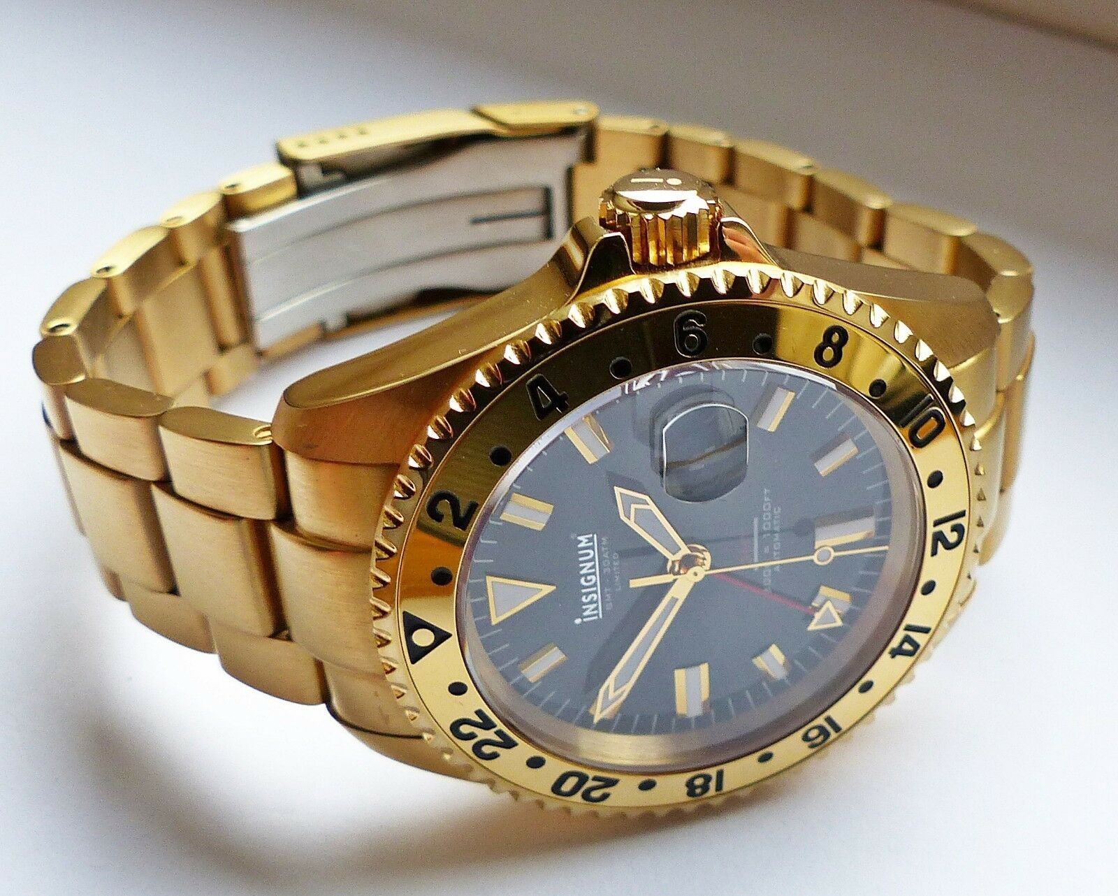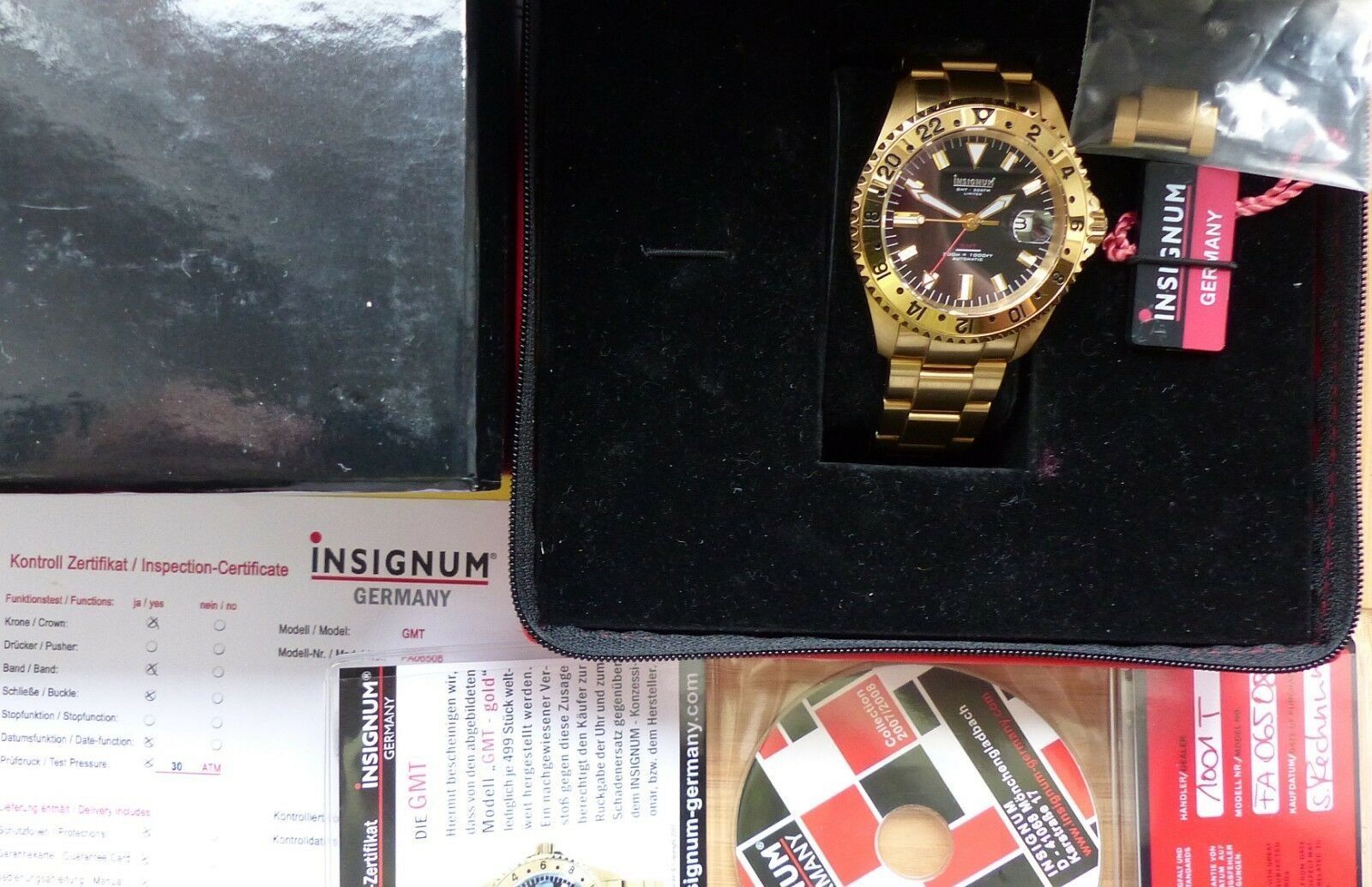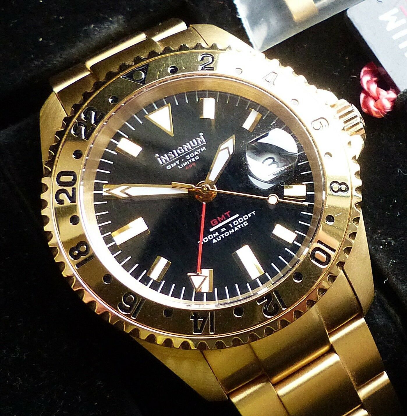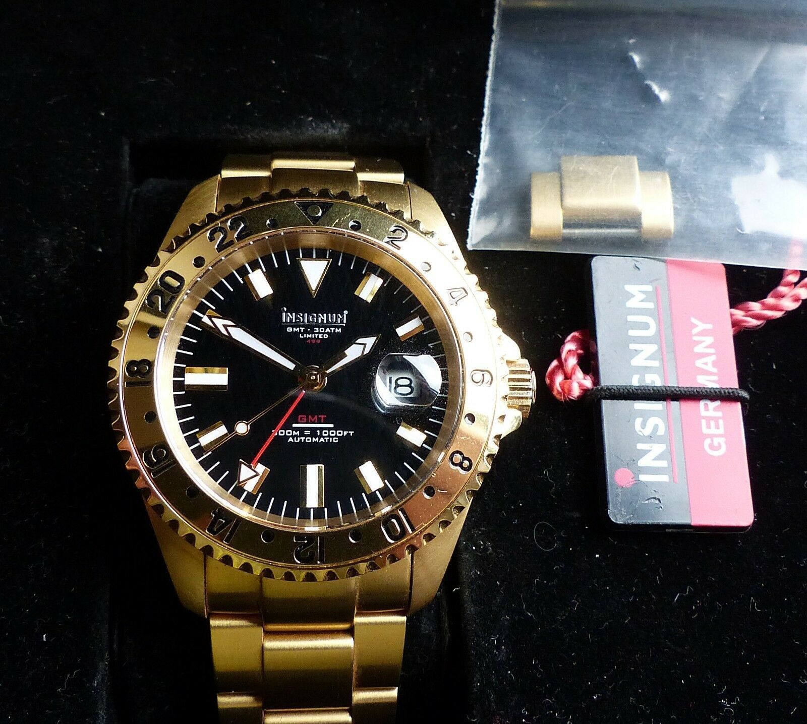 Hersteller : Insignum Deutschland Modell GMT WR300 Limited Edition No. 162 499 Taucheruhr mit grosser zentraler Sekunde, Schwarzem Zifferblatt mit aufgesetzten Weiß-Goldenen Strichindexen, Datum auf 3.00 Uhr, verschraubter Krone, Saphirglas mit Datumlupe, drehbarer Lünette etc. Uhrwerk : Automatisch