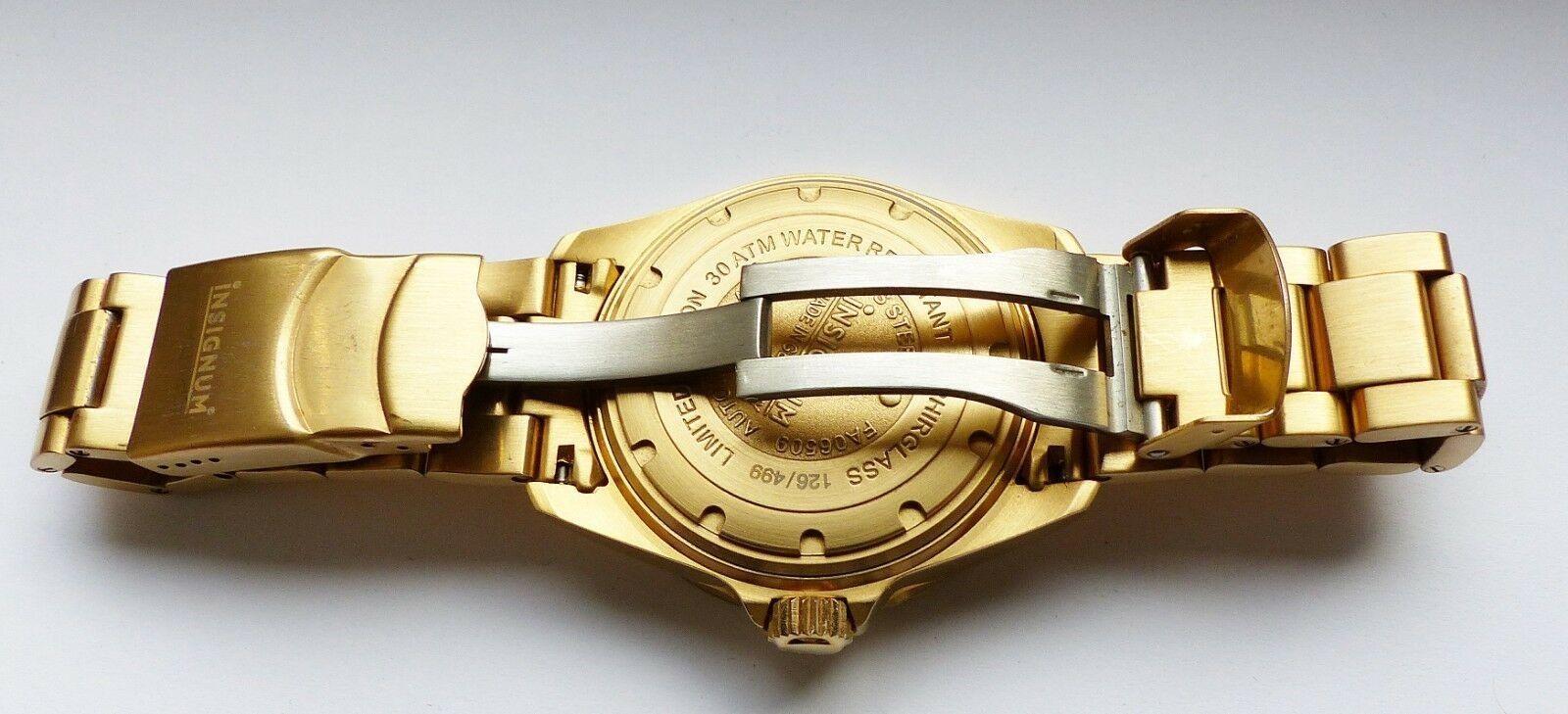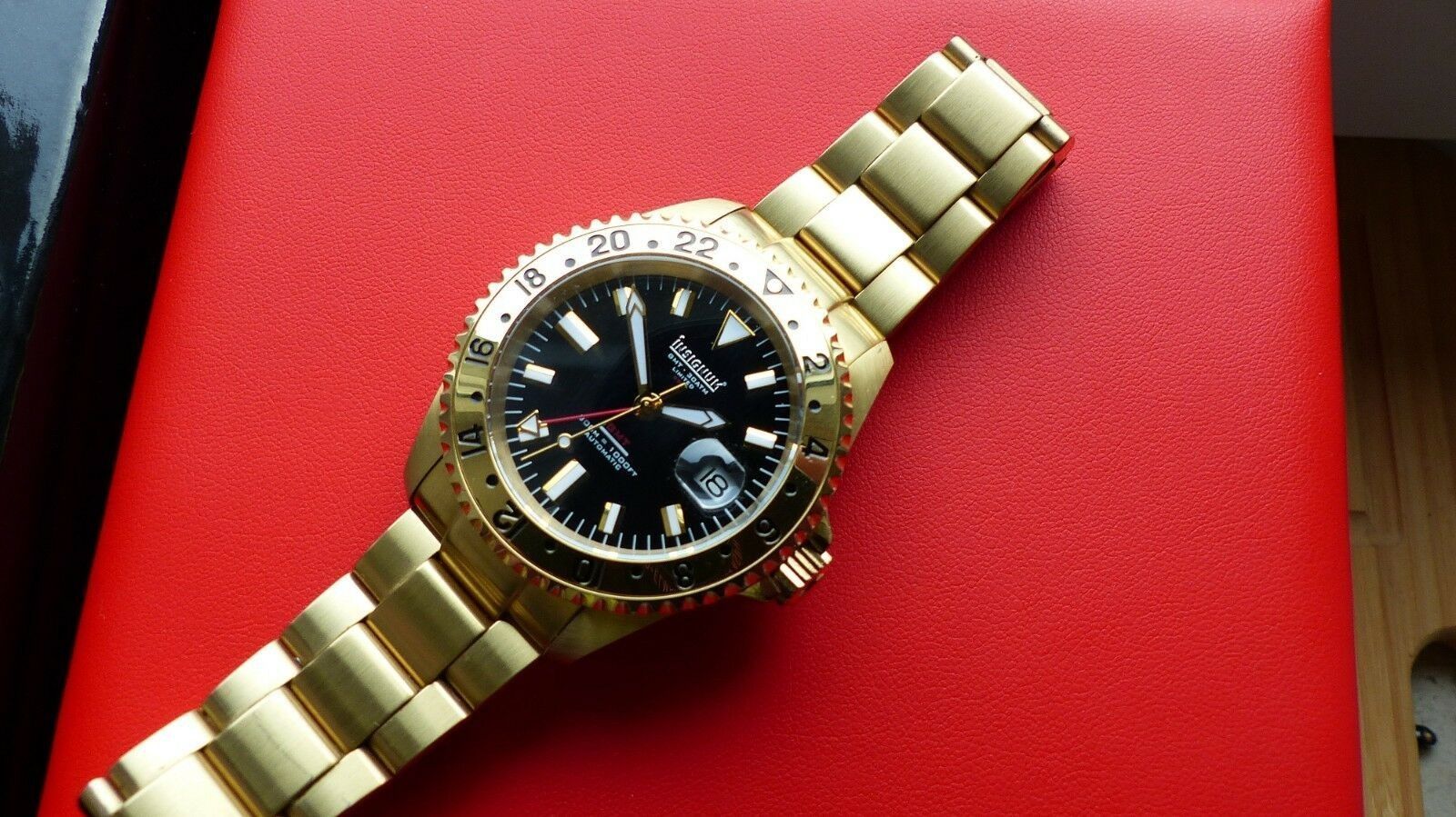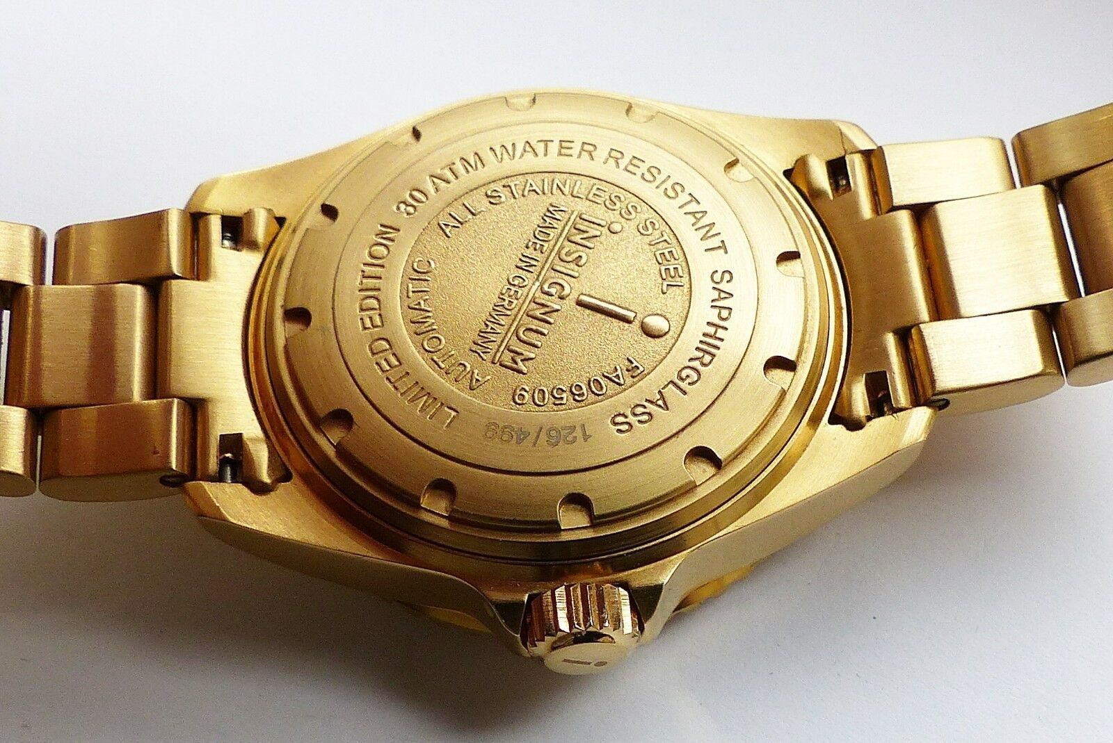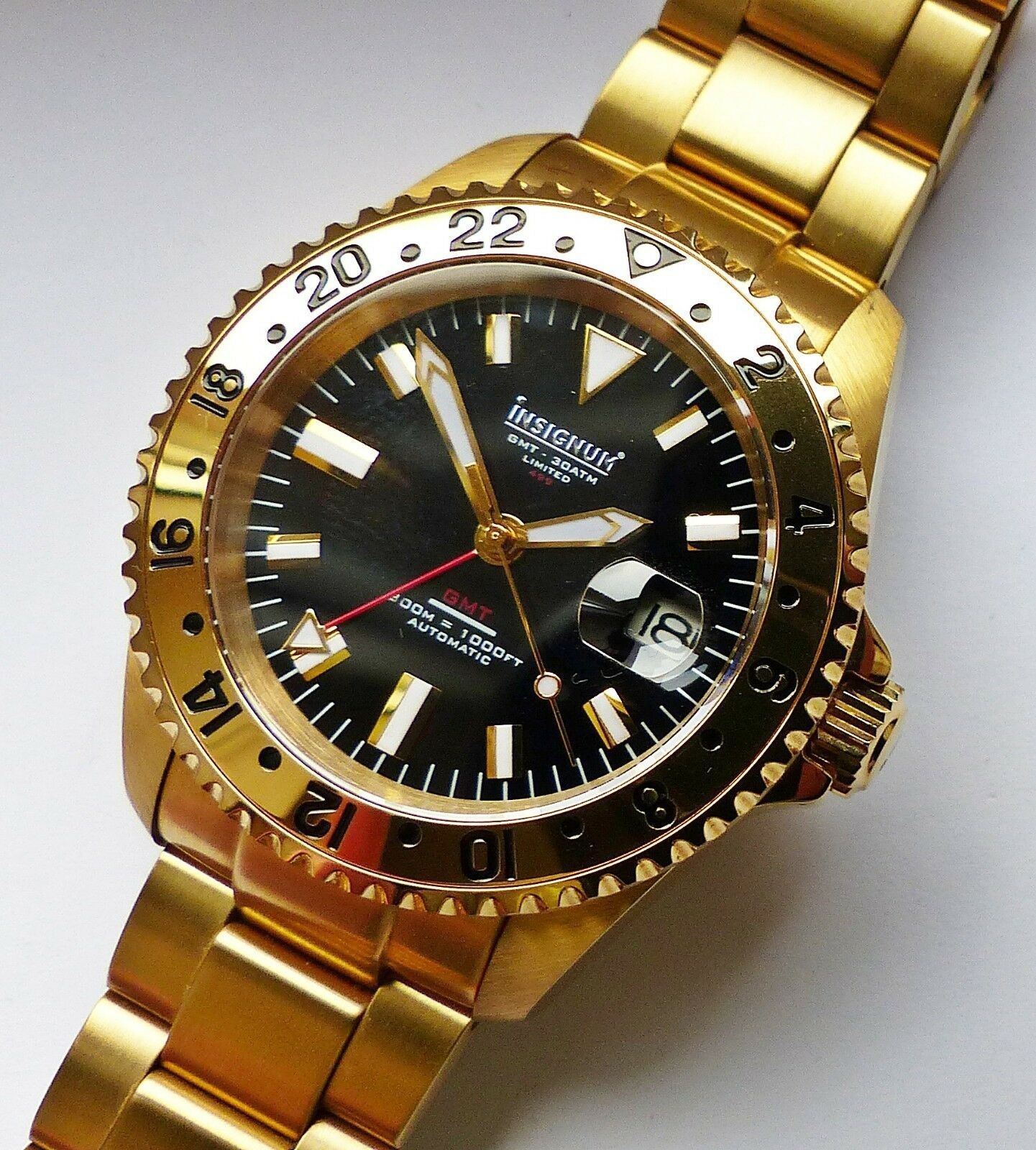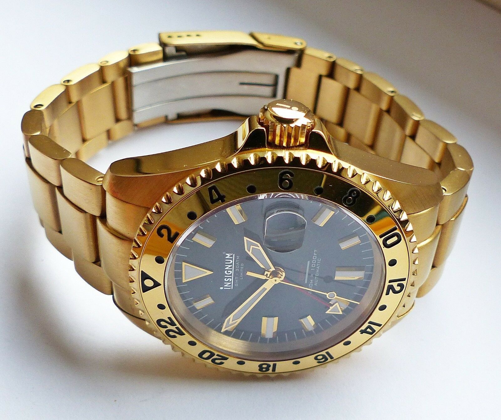 Hersteller : Insignum Deutschland Modell GMT WR300 Limited Edition No. 162 499 Taucheruhr mit grosser zentraler Sekunde, Schwarzem Zifferblatt mit aufgesetzten Weiß-Goldenen Strichindexen, Datum auf 3.00 Uhr, verschraubter Krone, Saphirglas mit Datumlupe, drehbarer Lünette etc. Uhrwerk : Automatisch