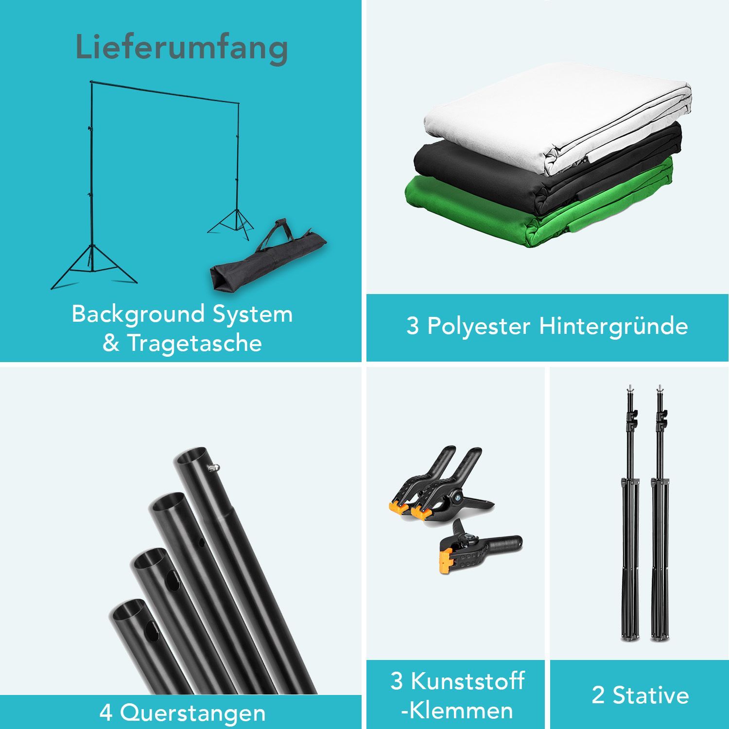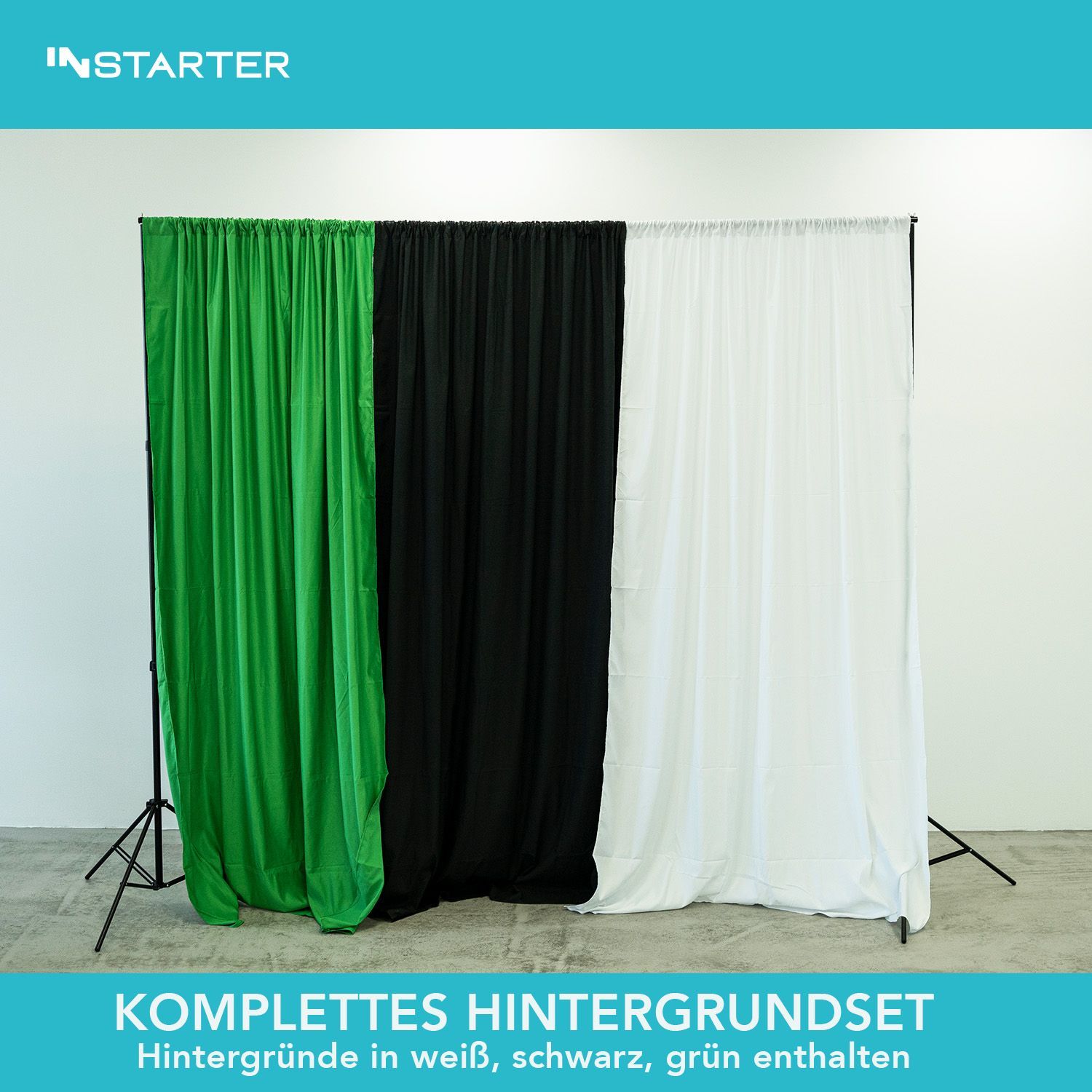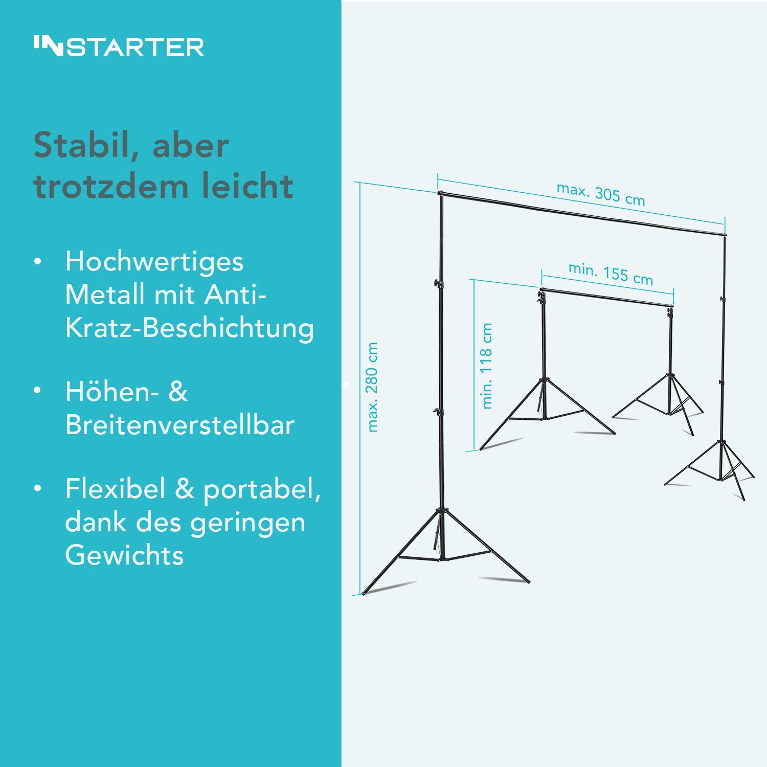 [Flexibles Hintergrundsystem von Instarter] - Perfekt für Fotostudios, Videokonferenzen, YouTube, TikTok oder Livestreams. Die Breite lässt sich auf 1,55 m, 2,30 m oder 3,05 m einstellen, während die Höhe von 1,18 m bis 2,8 m variierbar ist. So passt das Hintergrundsystem ideal für verschiedenste Setups und Anwendungen. - [Drei hochwertige Hintergründe] - Das Set enthält drei knitterarme Polyester-Hintergründe in Grün, Weiß und Schwarz mit den Maßen 1,79 x 2,75 m. Ideal für G