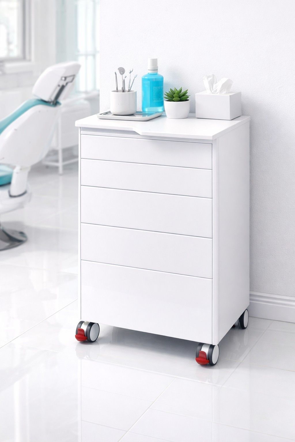 Instrumentenwagen für die Zahnarztpraxis Mobiler Rollwagen mit 5 Schubladen. Dieser Instrumentenwagen / Beistellwagen zeichnet sich aus durch seinen modernen und zeitlosen Stil. Der Instrumentenwagen ist aus elektroverzinktem und pulverbeschichtetem Stahlblech hergestellt., er ist dadurch besonders robust und langlebig.