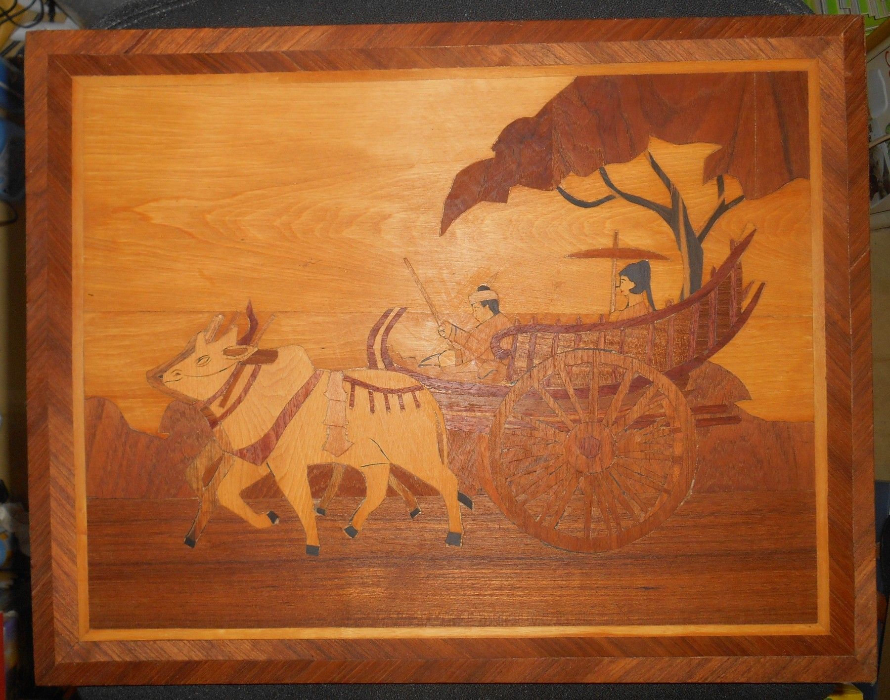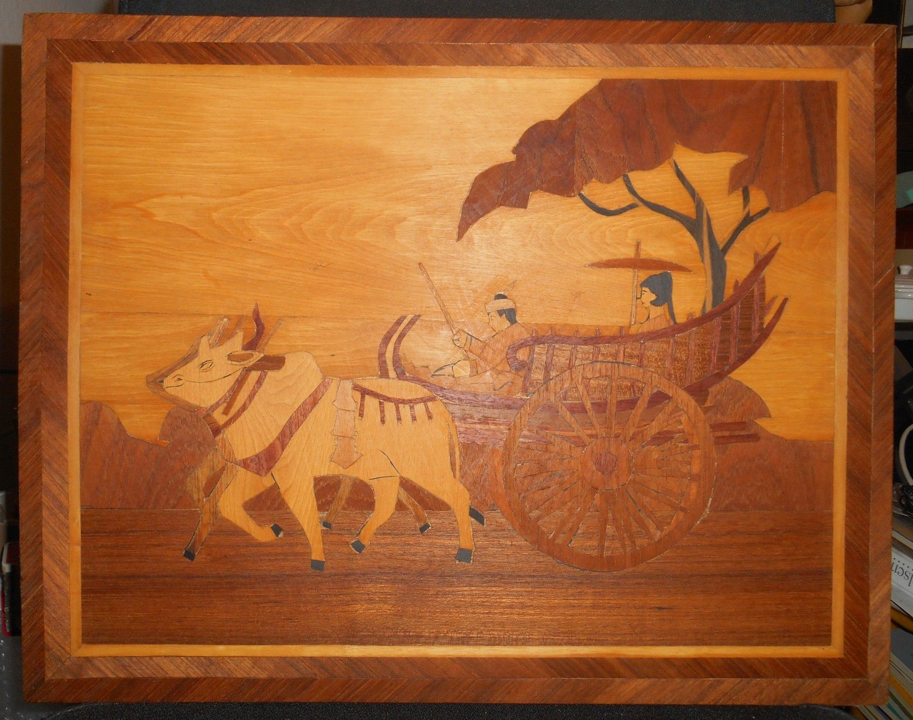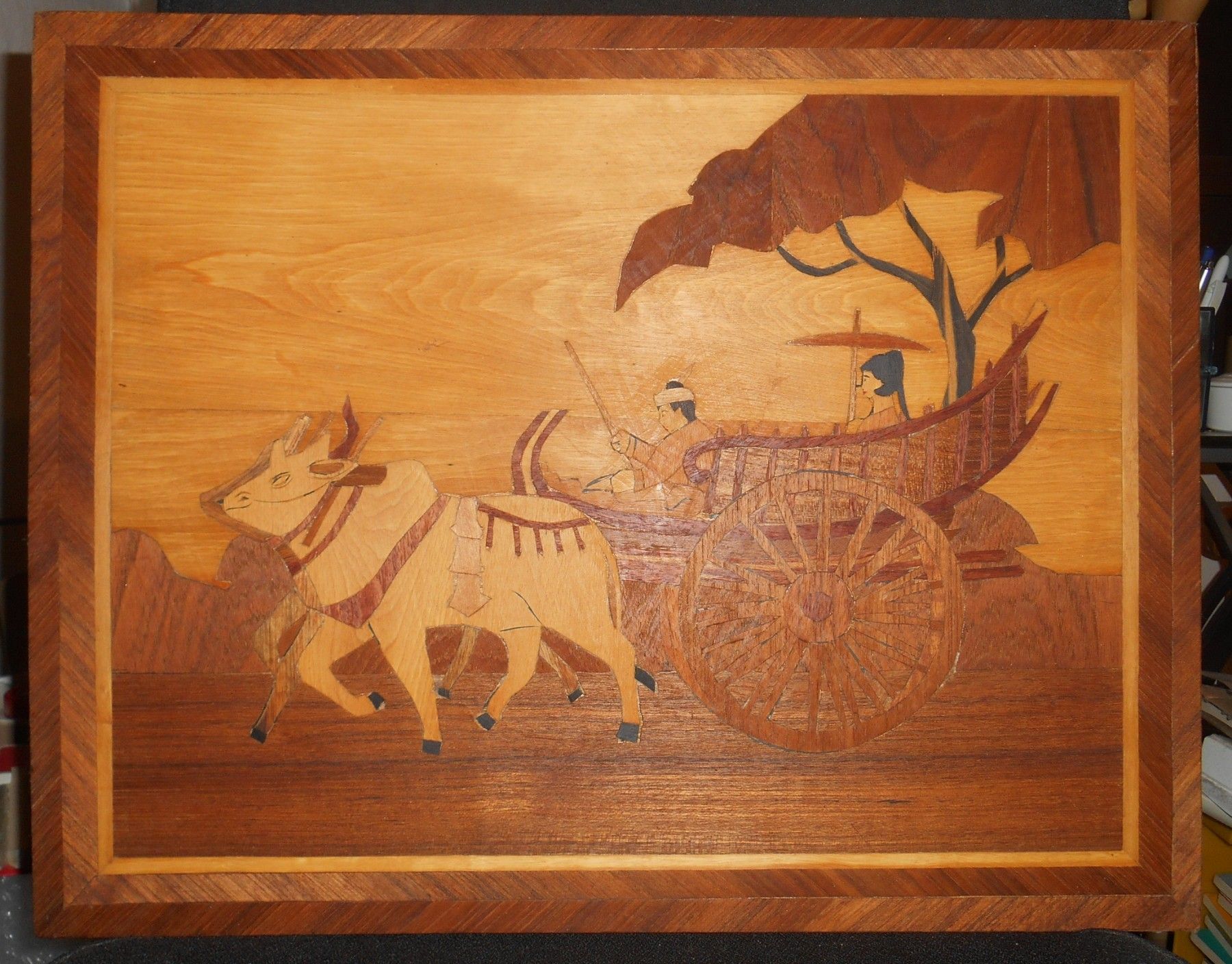 Intarsienbild aus Birma (heute Myanmar) – Paar mit Ochsenkarren