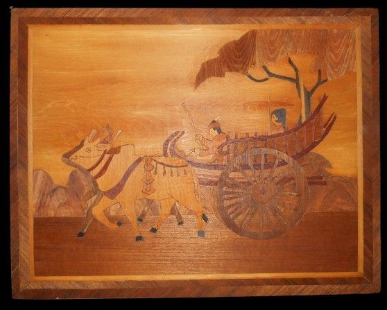 Intarsienbild aus Birma (heute Myanmar) – Paar mit Ochsenkarren