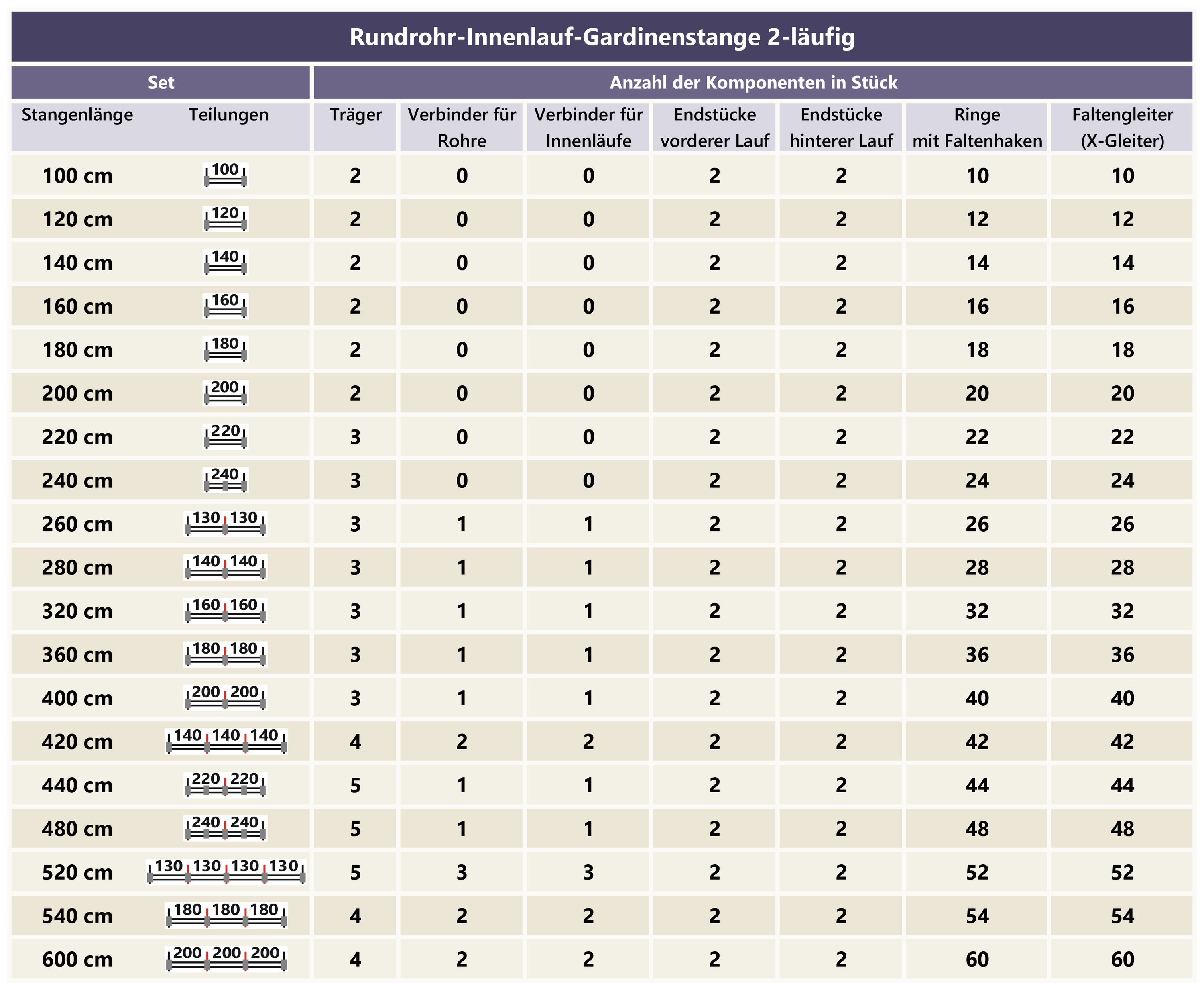 100 cm, 120 cm, 140 cm, 160 cm, 180 cm, 200 cm, 220 cm, 240 cm, 260 cm (2 x 130 cm), 280 cm (2 x 140 cm), 320 cm (2 x 160 cm) und weitere.