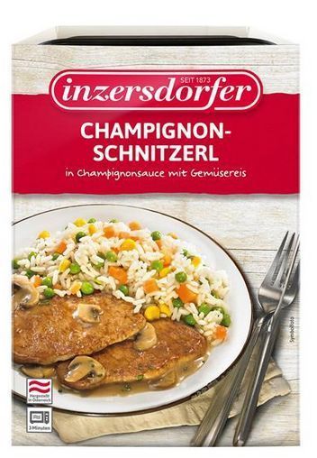 Inzersdorfer Champignonschnitzerl aus Fleischstücken zusammengefügt mit Gemüsereis, Champignonsauce, Fisolen, Mais und Karotten 380 g - 4 Varianten Stückzahlen Produktdetails Inzersdorfer Champignonschnitzel von Inzersdorfer 380 Gramm Packung Champignonschnitzerl mit buntem Gemüsereis aus Fisolen, M