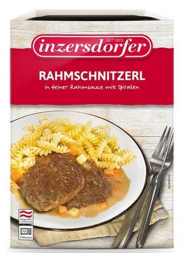 Inzersdorfer Rahmschnitzerl aus Fleischstücken zusammengefügt in feiner Rahmsauce mit Frühstücksspeck und Spiralnudeln 380 g - 4 Varianten Stückzahlen Produktdetails Inzersdorfer Rahmschnitzel mit Spiralen von Inzersdorfer 380 Gramm Packung Rahmschnitzerl in einer feinen Gemüse-Rahm-Sauce aus Seller