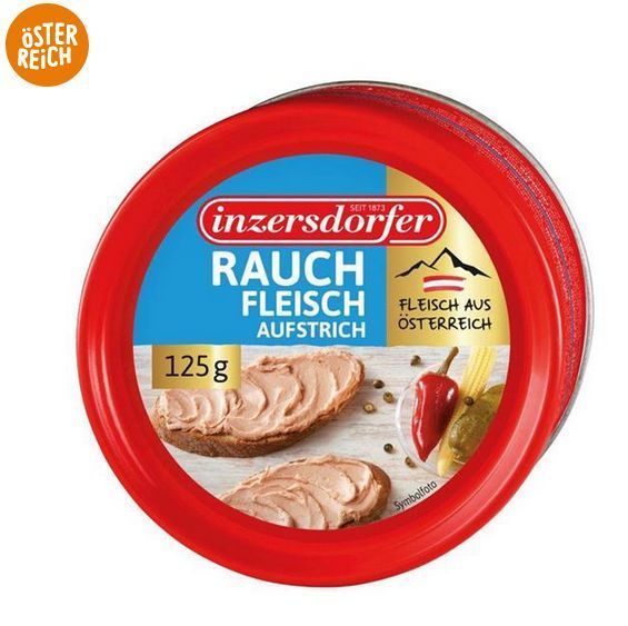 Inzersdorfer Rauchfleischaufstrich 125 Gramm Dose - 5 Varianten Stückzahlen Cremiger Aufstrich aus zart geräuchertem Schinken. Durch Erhitzen natürlich haltbar gemacht. Geprüfte Qualität aus Österreich. Geprüfte Qualität aus Österreich. Nach den hohen Qualitätsanforderungen der Firma Inzersdorfer so
