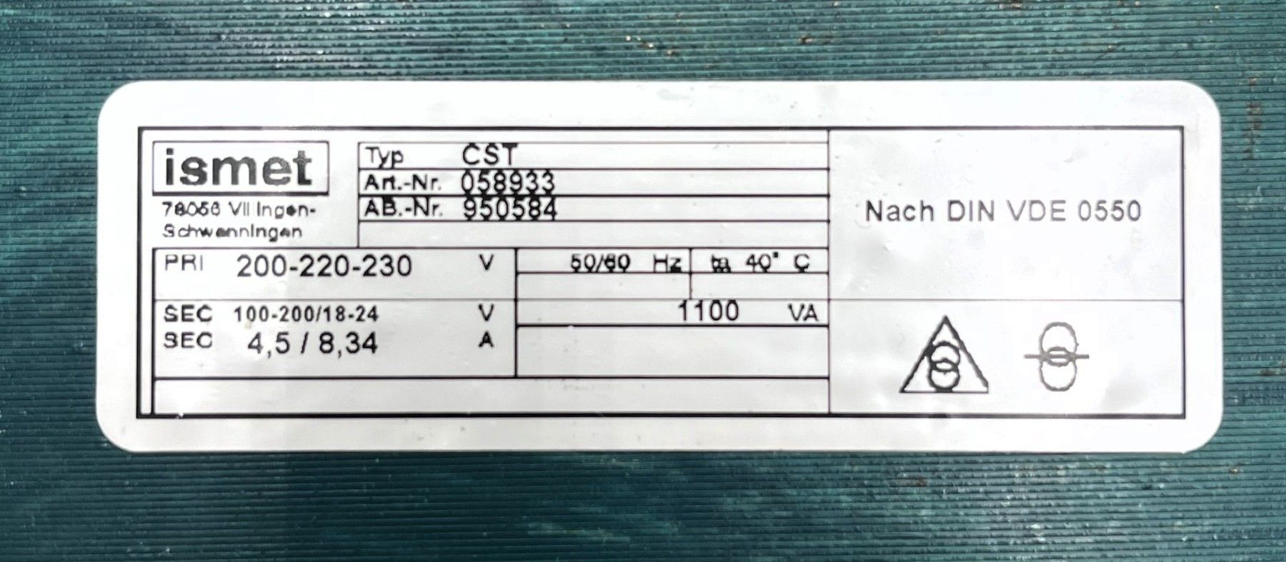 ISMET Transformator Typ: CST Primär 200, 220, 230 V Sekundär 100-200 V 4,5 A 18 - 24 V 8,34 A VA 1100 Gewicht: 13,22 kg Maße LxBxH: 140x155x145 mm nach VDE 0550 Zustand: gebraucht (Top - Zustand) Unsere Artikelnummer: T10 200 Sicherheitsprüfung nach VDE durchgeführt Sie erhalten eine Rechnung mit ab