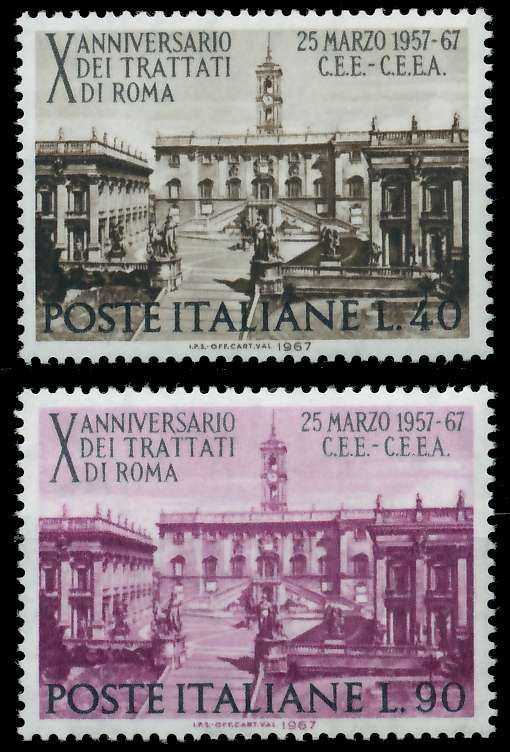 ITALIEN 1967 Nr 1221-1222 postfrisch 10. Jahrestag Römische Verträge 0.23€ incl. MwSt: Differenzbesteuert zzgl. Versandkosten Bestell-Nr.: S20E38E Katalog-Nr: MICHEL (1221 - 1222) Katalogpreis: 0,5 EUR Qualität: Normal Erhaltung: Postfrisch ** Einheit: Satz Bogenlage: Gummierung: Geprüft: Versa