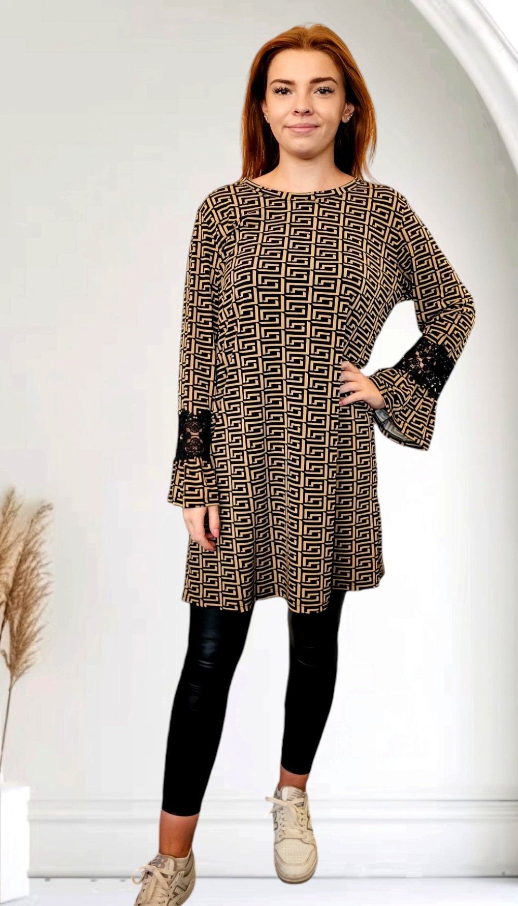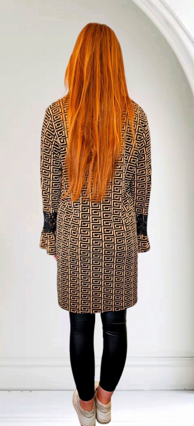 Italy 38 40 42 Kofferkleid Kleid langarm Spitze schöner Print Camel/Schwarz