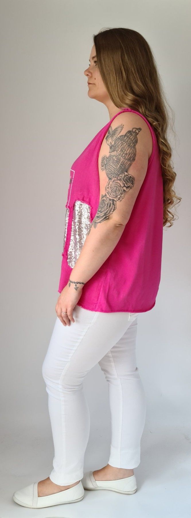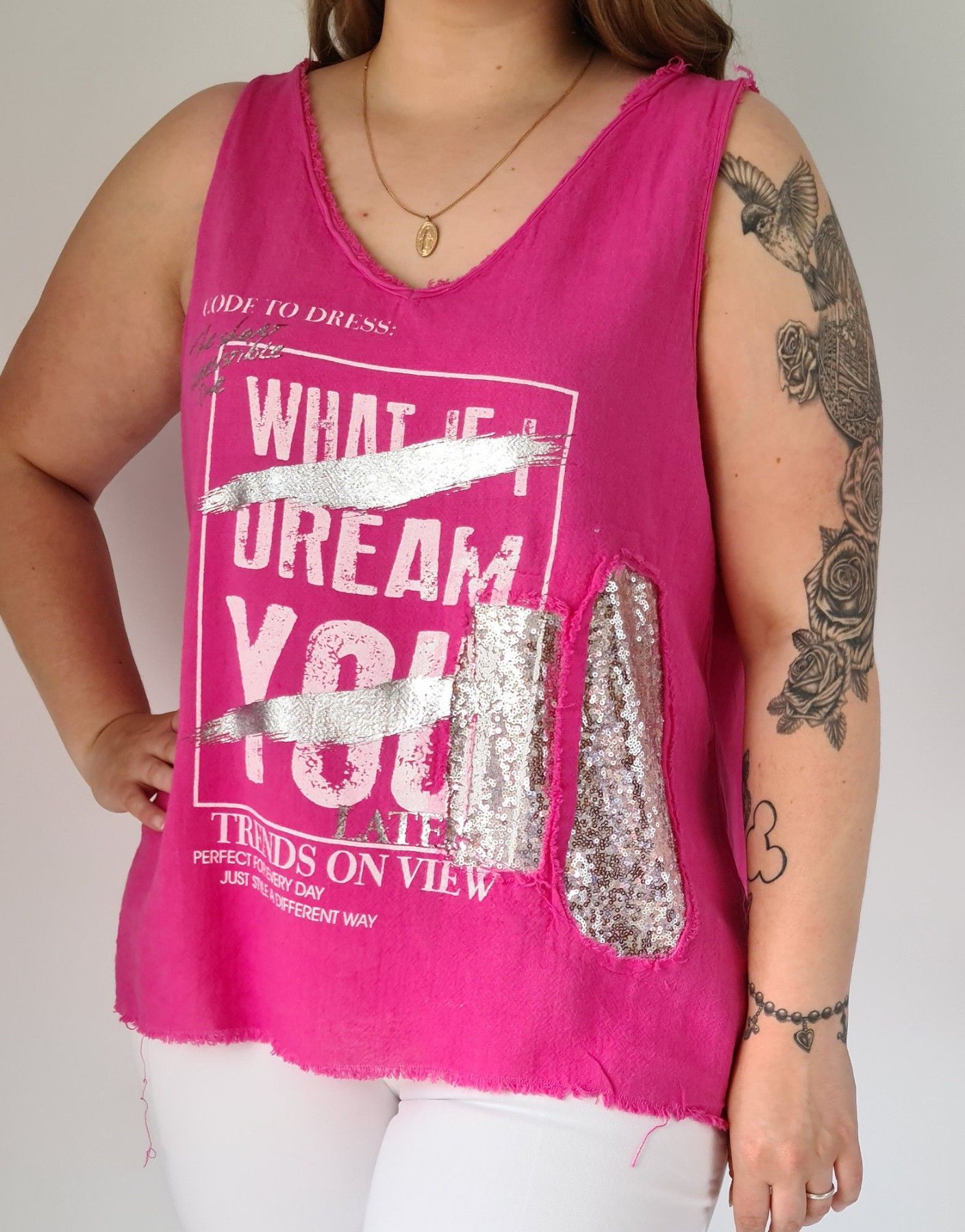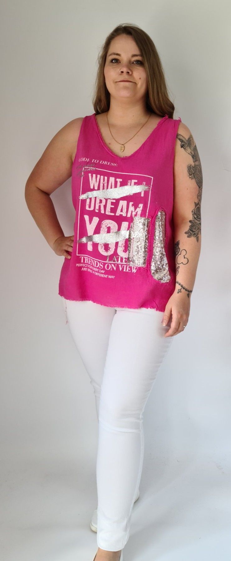 Italy 38 40 42 Top Shirt Fransen Pailletten Schriftzug Metallic Leinen Baumw. Pink