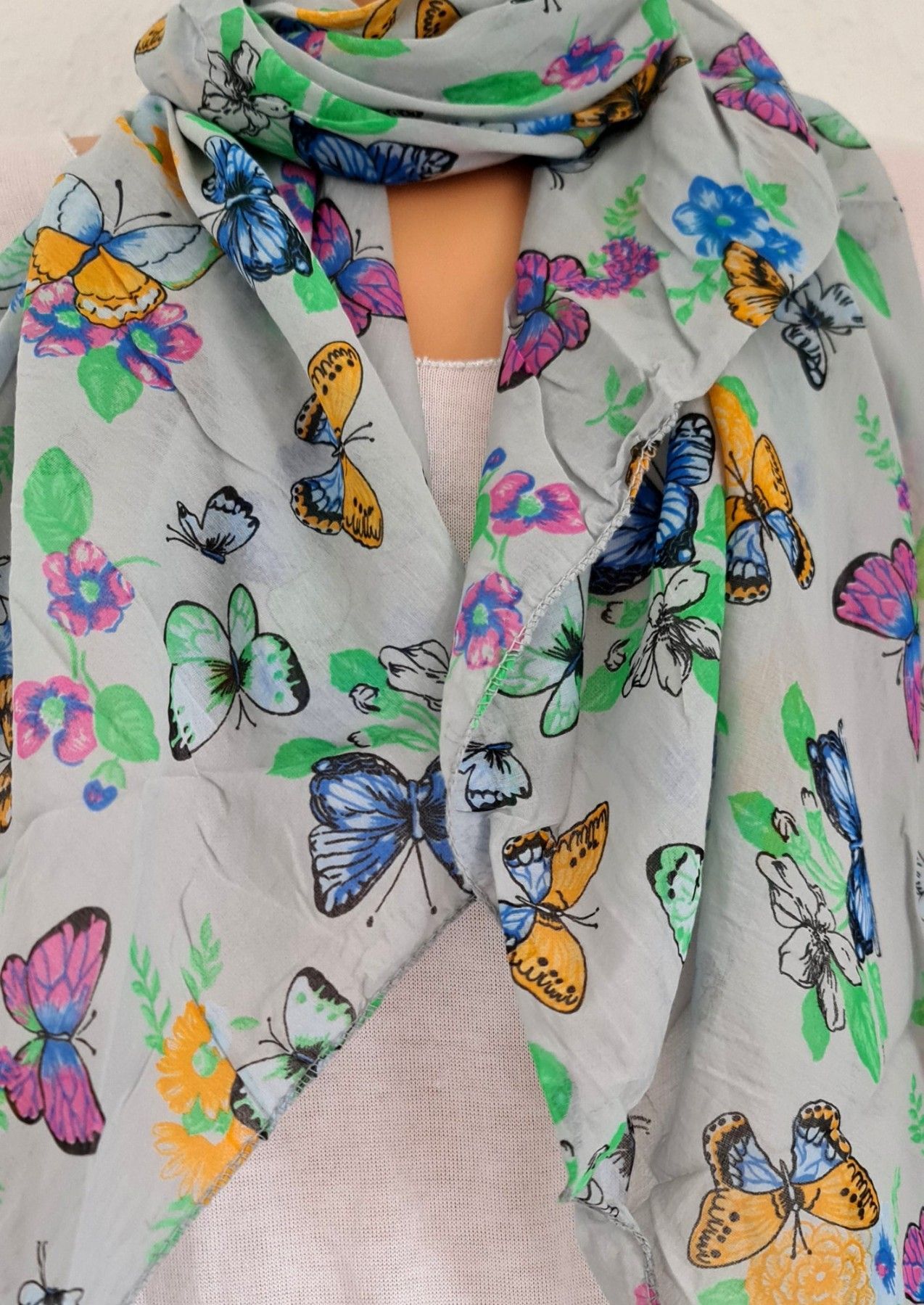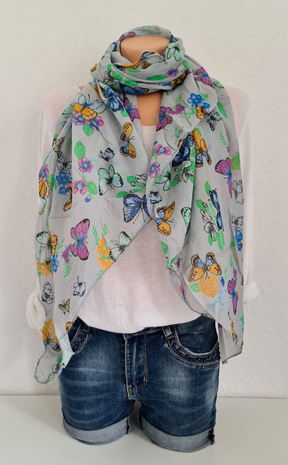 Italy Blogger Schal Halstuch Seide/ Baumwolle asymetrisch Schmetterlinge Hellgrau