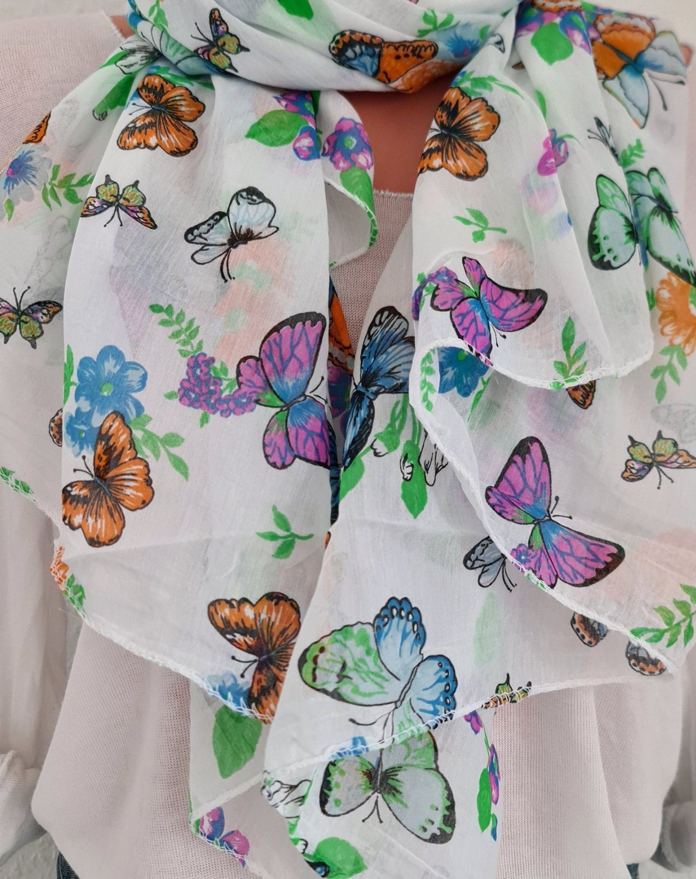 Italy Blogger Schal Halstuch Seide/ Baumwolle asymetrisch Schmetterlinge Weiß