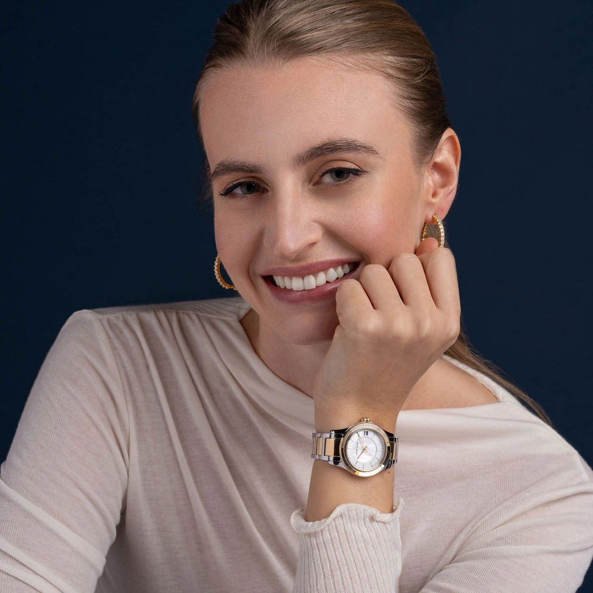 klassische Armbanduhr für Frauen, mit präzisem Quarzwerk, Datum mit Schnellkorrektur, beiges Perlmutt-Zifferblatt, lumineszierende Zeiger, goldfarbene Indizes, Stundenpunkte mit Kristallen akzentuiert, Gehäuse aus poliertem Edelstahl, geschliffene, goldfarbene Lünette, geriffelte Krone mit Logo, gehärtetes Mineralglas, Armband aus poliertem Edelstahl, mittig gold ionen-plattiert, Sicherheitsfaltschließe mit Drücker und Logo, wasserdicht bis 5 bar, Breite (ohne Krone) 34 mm, Höhe 8,5 mm