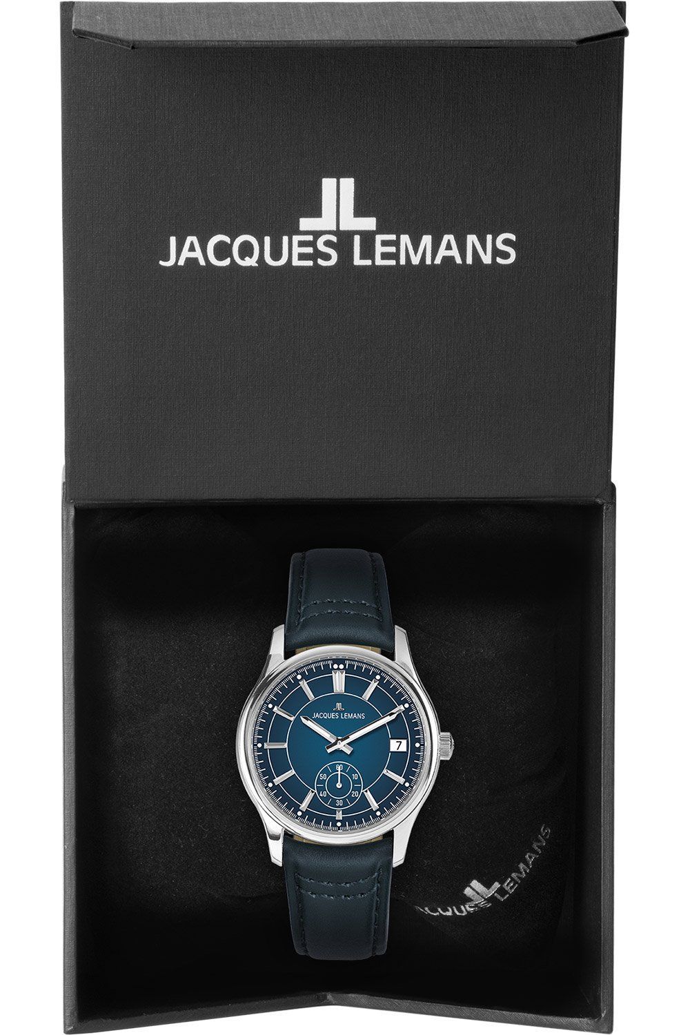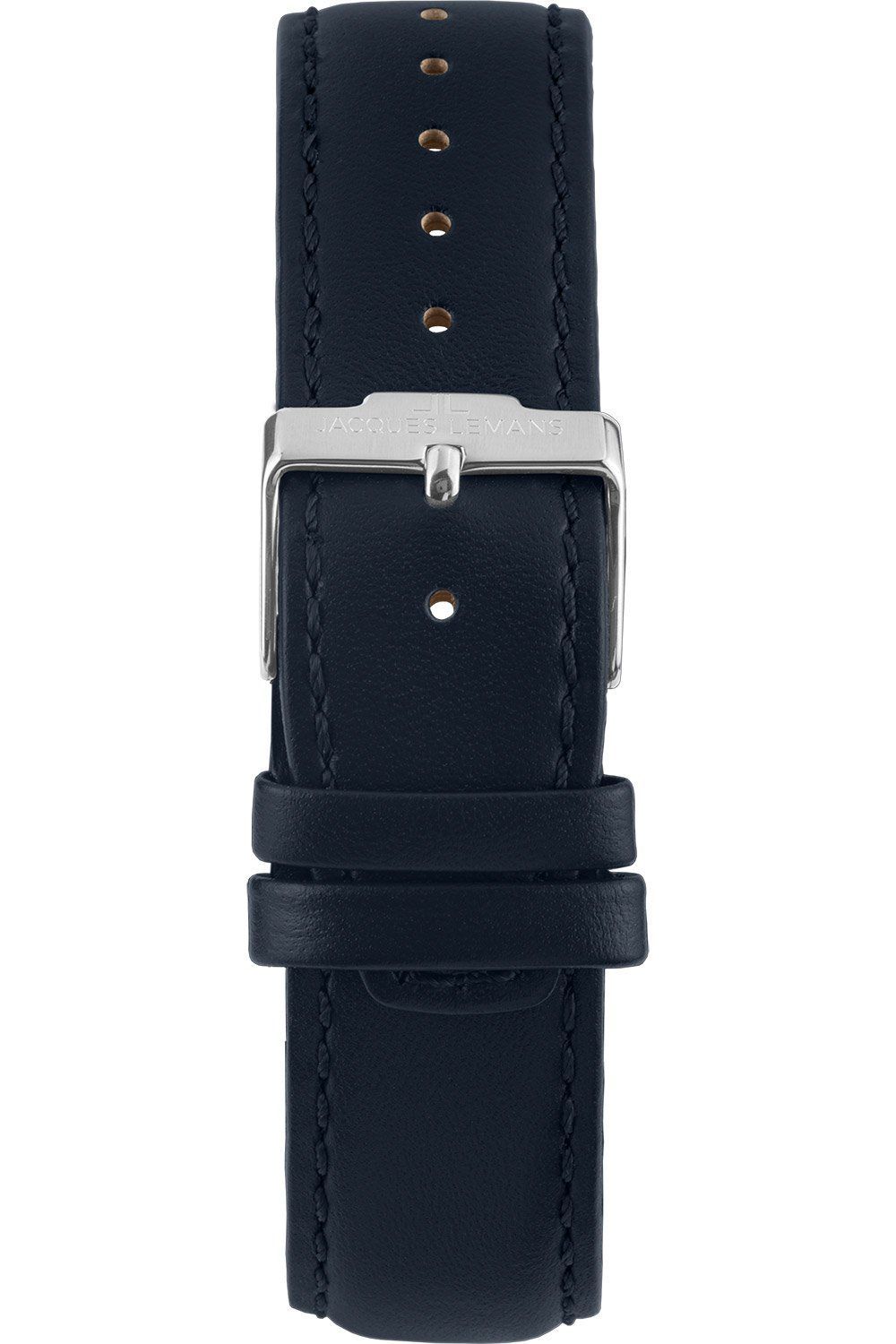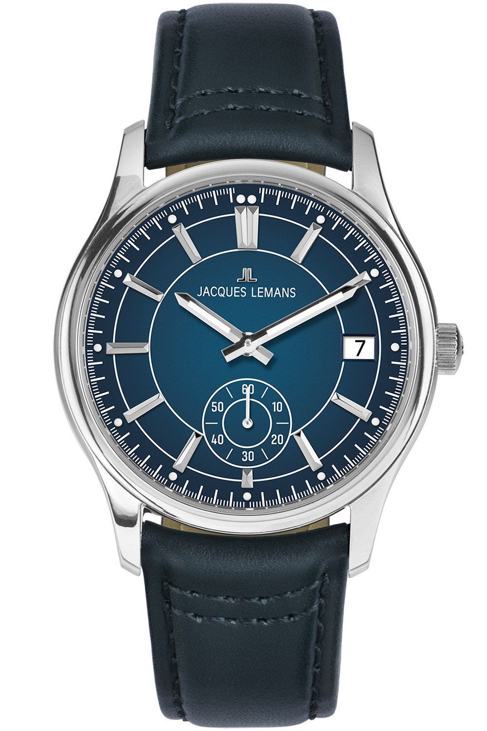 trendige Armbanduhr für Männer, mit präzisem Quarzwerk, Datumsanzeige, blaues Zifferblatt mit leichtem Farbverlauf, lumineszierende Zeiger und Stundenpunkte, geschliffene Indizes, kleine Sekundenanzeige, Gehäuse aus poliertem Edelstahl, verschraubter Gehäuseboden, geriffelte Krone mit Logo, gehärtetes Mineralglas, Armband aus dunkelblauem Leder mit Ziernähten, polierte Dornschließe mit Logo, wasserdicht bis 10 bar, Breite (ohne Krone) 41 mm, Höhe 10,5 mm