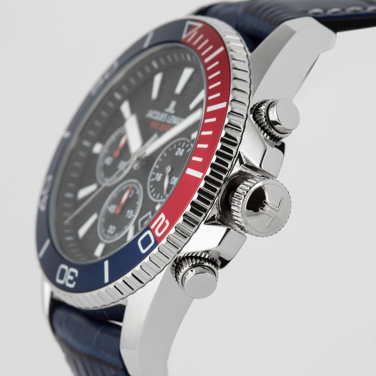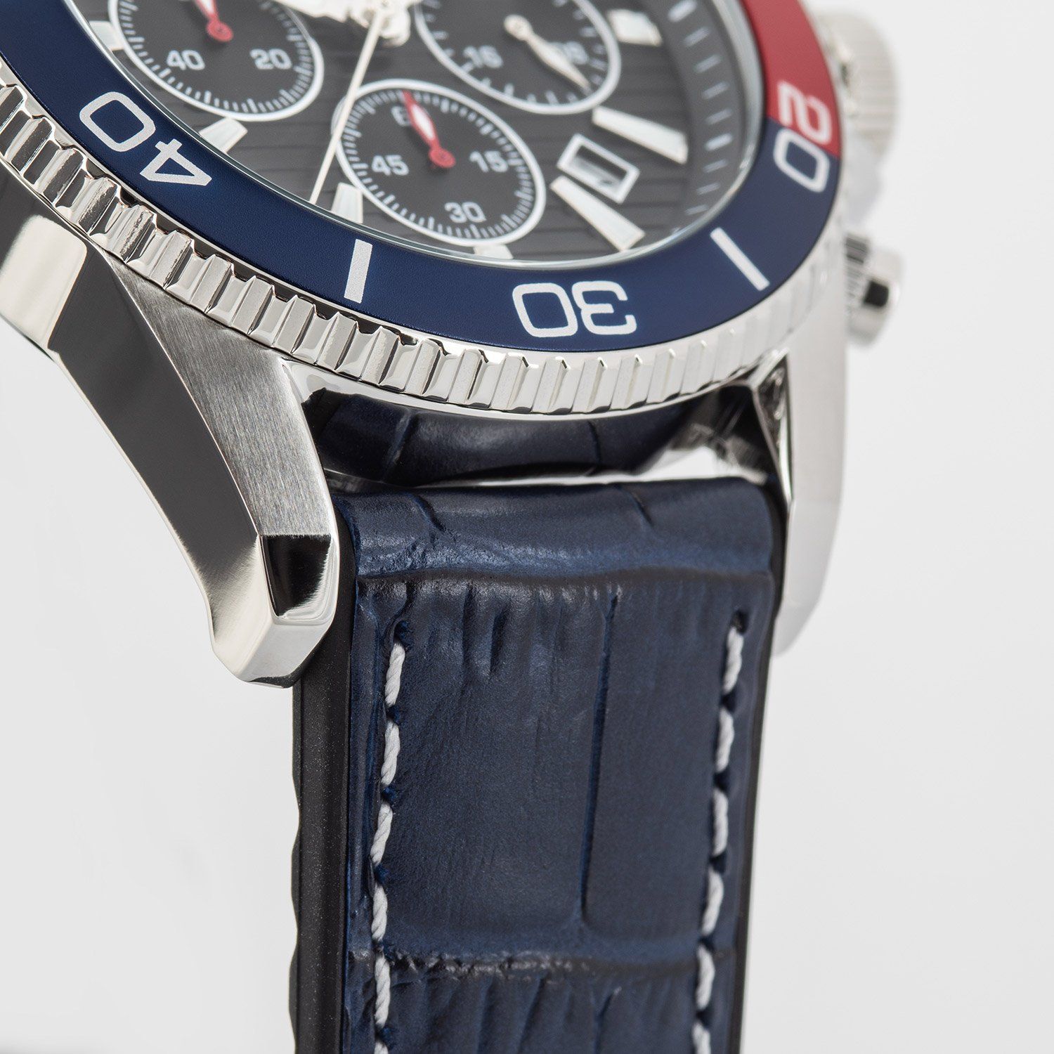 moderne Herren-Armbanduhr, mit Chrono-Quarzwerk, Datum mit Schnellkorrektur, Stoppfunktion bis 60 Minuten in 1/1 Sekundenschritten, 24-Stunden-Anzeige, schwarzes Zifferblatt mit feiner Struktur, Hilfszifferblätter mit Sunray-Schliff, Zifferblattrand mit Minuterie, lumineszierende Zeiger und Indizes, zentraler Sekundenzeiger, Gehäuse aus poliertem Edelstahl, matte Bandansätze, einseitig drehbare blau/rote Lünette mit Minutenskala, verschraubter Gehäuseboden, verschraubte Krone mit Flankenschutz u