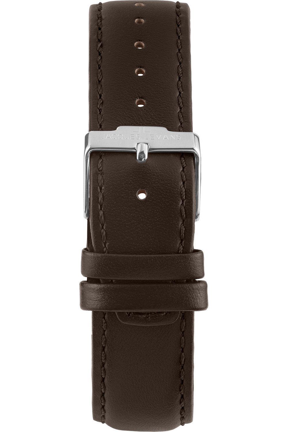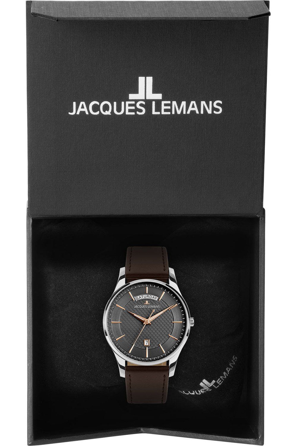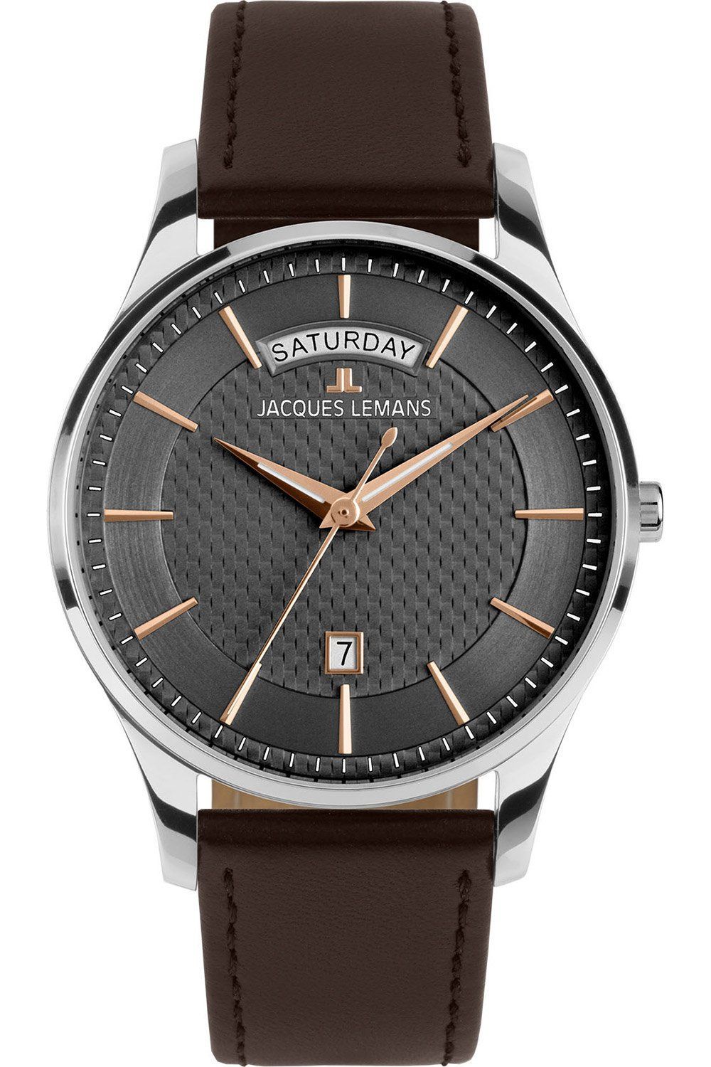 elegante Armbanduhr für Männer, mit präzisem Quarzwerk, Anzeige von Datum und Wochentag, anthrazitfarbenes Zifferblatt mit feiner Struktur, roségoldfarbene Zeiger und Indizes, zentraler Sekundenzeiger, Gehäuse aus poliertem Edelstahl, Krone mit Logo, gehärtetes Mineralglas, Armband aus dunkelbraunem Leder, polierte Dornschließe mit Logo, wasserdicht bis 5 bar, Breite (ohne Krone) 40 mm, Höhe 8 mm
