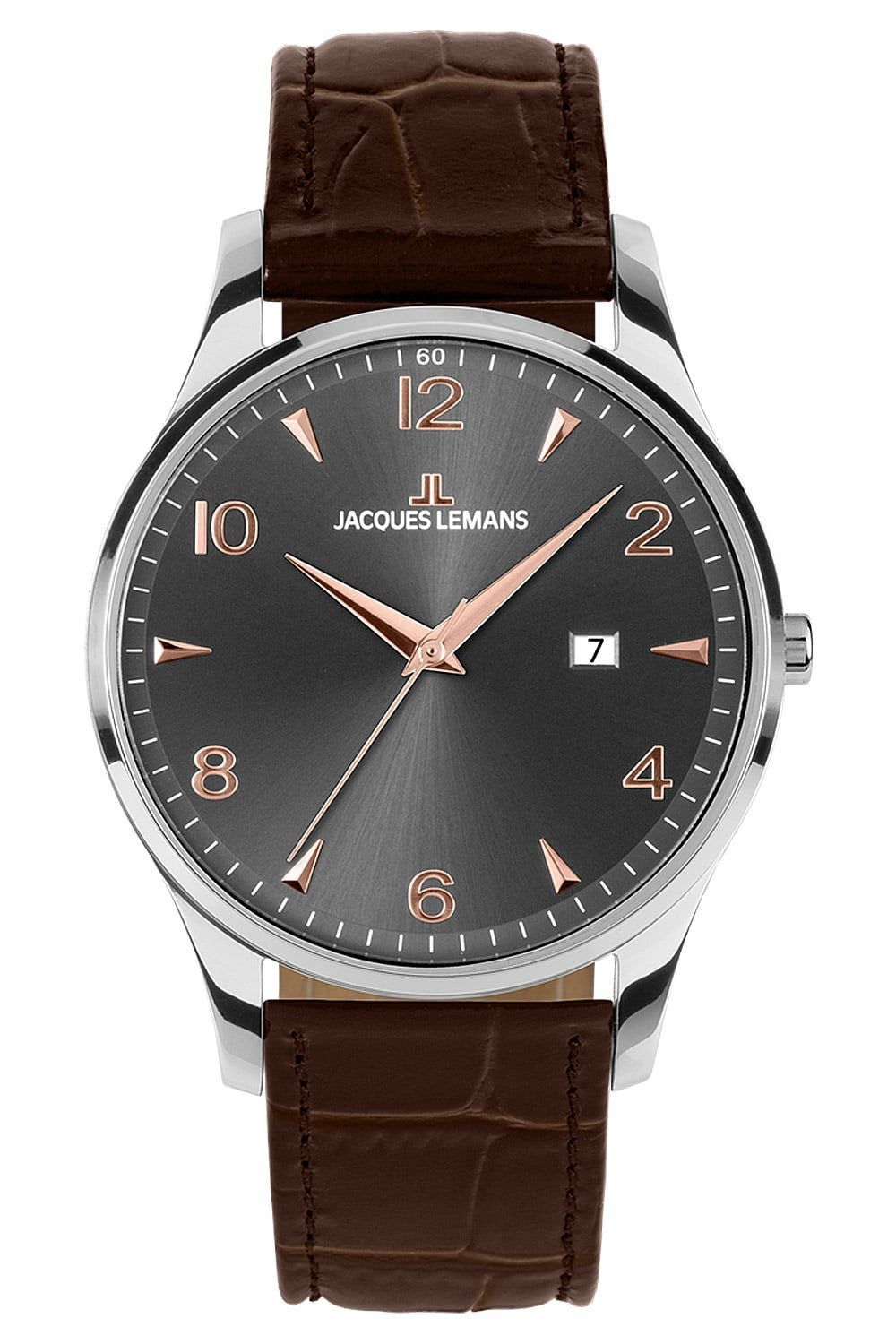 schicke Armbanduhr für Männer, präzises Quarzwerk, Datumsanzeige, dunkelgraues Sunray-Zifferblatt, roségoldfarbene Zeiger, Zahlen und Indizes, zentraler Sekundenzeiger, Gehäuse aus poliertem Edelstahl, Krone mit Logo, gehärtetes Mineralglas, Armband aus dunkelbraunem Leder mit Krokoprägung, Sicherheitsfaltschließe mit Logo, wasserdicht bis 5 bar, Breite (ohne Krone) 40 mm, Höhe 7,2 mm