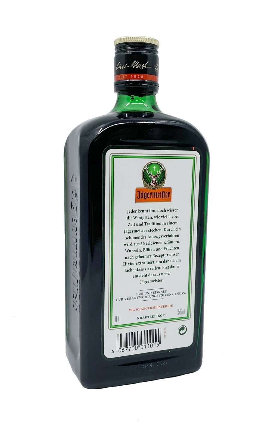 Jägermeister Das Original 0,7l 35%vol. Jägermeister Kräuterlikör - Das Original aus Wolfenbüttel. Inverkehrbringer: MAST-JÄGERMEISTER SE, Jägermeisterstraße 7-15, 38296 Wolfenbüttel, Deutschland