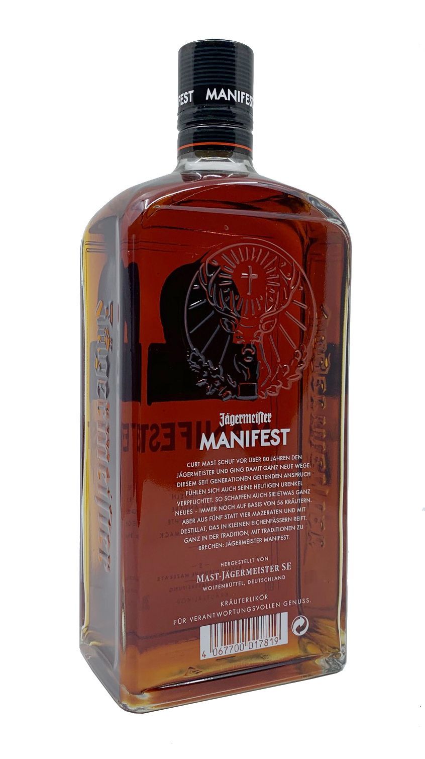 Jägermeister Manifest Kräuterlikör 1l 38%vol. Jägermeister Manifest Kräuterlikör 1l Beschreibung von Jägermeister Manifest: Wir glauben nicht an Kompromisse. Wir glauben an das Außergewöhnliche. Schon immer. Diese Haltung hat uns stets dazu verholfen, unseren eigenen Weg zu gehen – seit 1878.