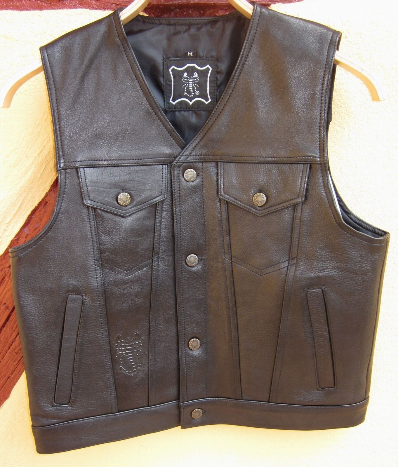 Lederweste Six Poket im Jeansjacken - Style Spitzenklasse Bikerweste der Firma Skorpion vormals Gensler. Eine Lederweste aus hochwertigem Rindnappa-Leder im klassischen Jeansjacken - Stil. Einfach, zeitlos und immer aktuell. Wie es sich für so eine Lederweste gehört mit 4 Außentaschen (2 Brust- und