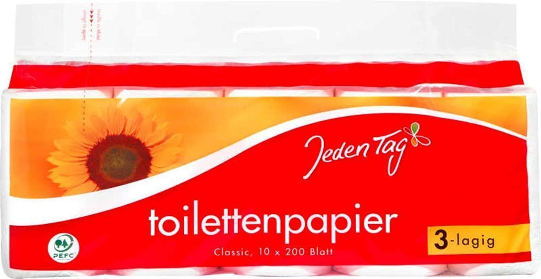 Jeden Tag Toilettenpapier Classic 10x 180 Blatt 3-lagig weiß - 4 Varianten Toilettenpapier 3-lagig, 100% reiner Frischzellstoff, chlorfrei gebleicht Anzahl Rollen: 10 Anzahl Blätter pro Rolle: 180 Anzahl Lagen: 3 Bitte beachten Sie zusätzlich immer die Angabe auf der Produktverpackung. Die Angaben a