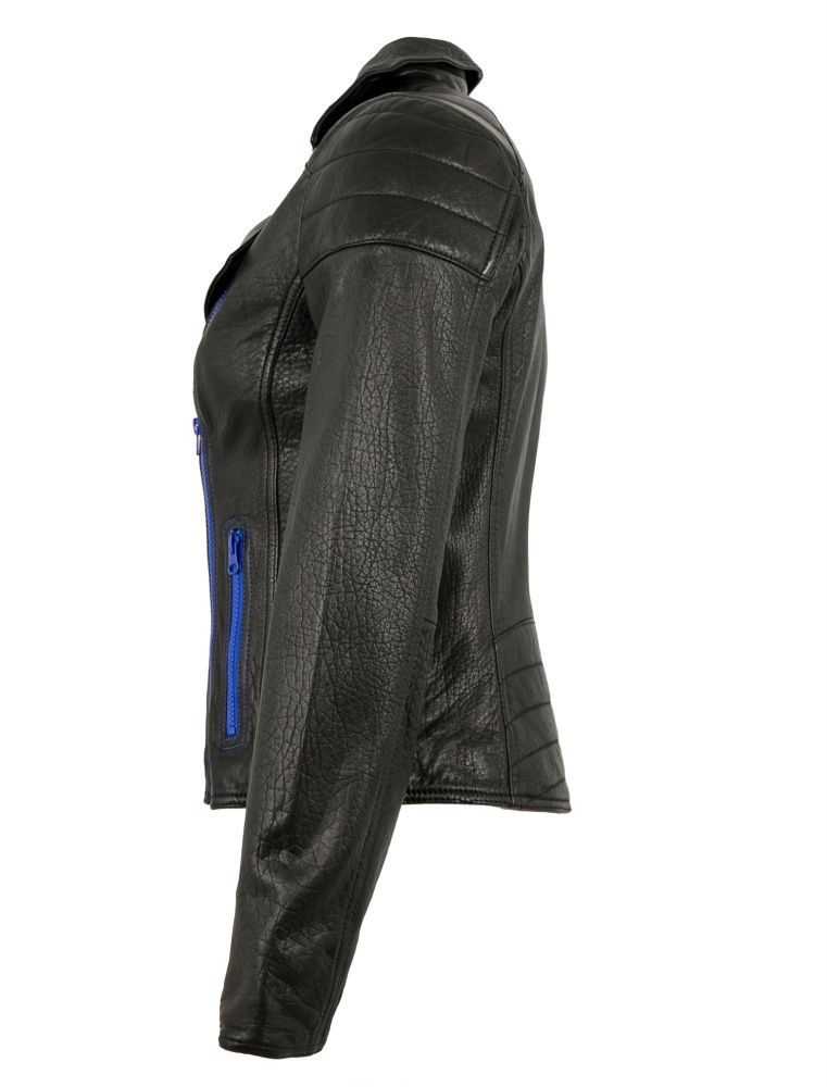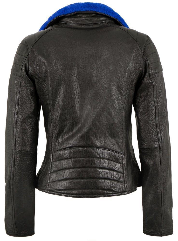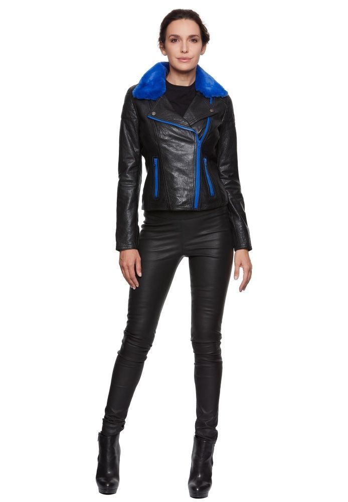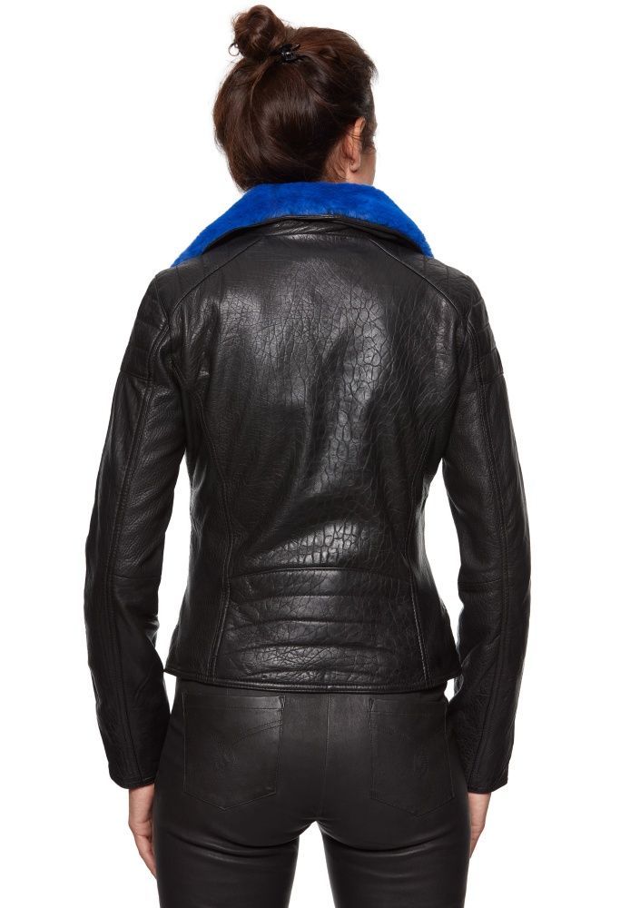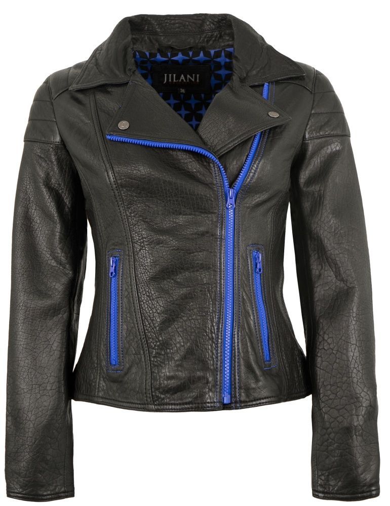 Jilani - Damen Lederjacke Bikerjacke Lammnappa schwarz / royalblau
