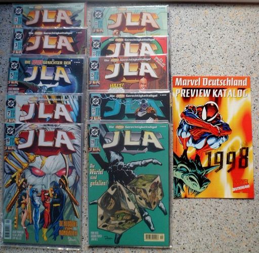Wegen Sammlungsauflösung biete ich hier 20 Comics aus dem Dino Verlag JLA Nr. 1 - Nr. 20 (Die neue Gerechtigkeitsliga) ( 1997-1998 ) + Marvel Deutschland Preview Katalog 1998 Zustand dem Alter entsprechend gut erhalten. Die Hefte wurden nach dem Lesen in einer Schutzhülle im Bücherschrank aufbewahrt