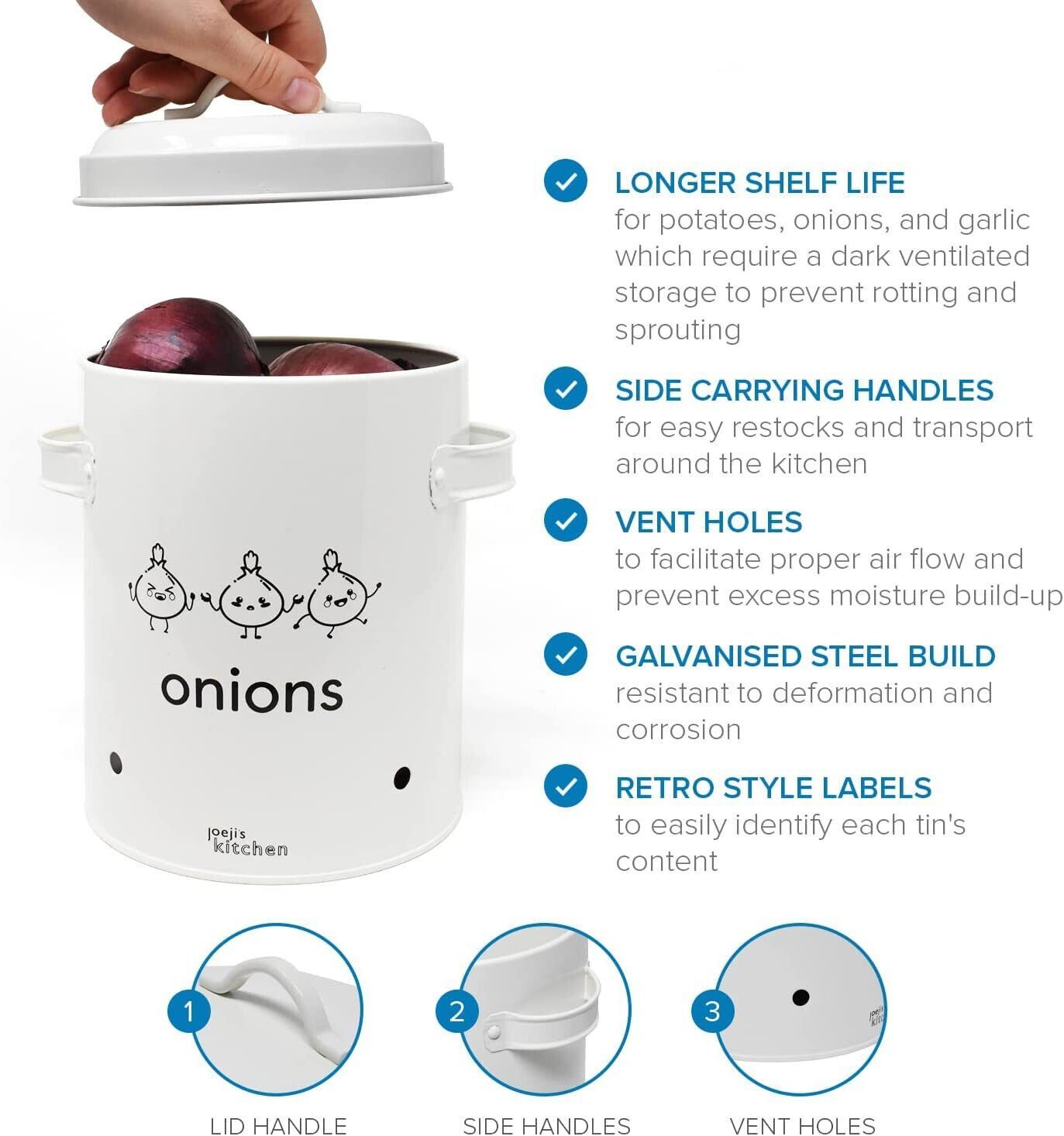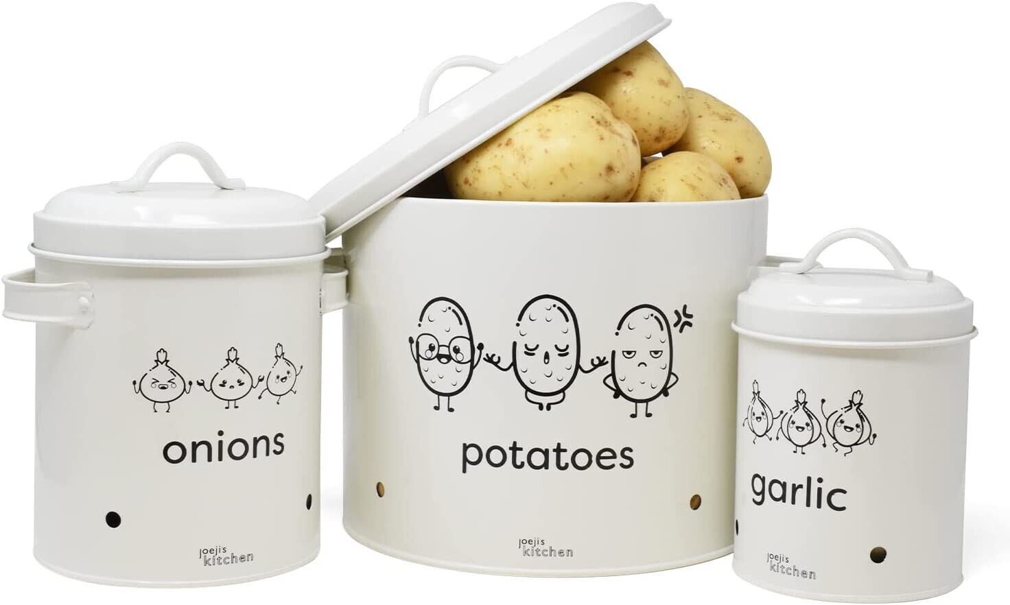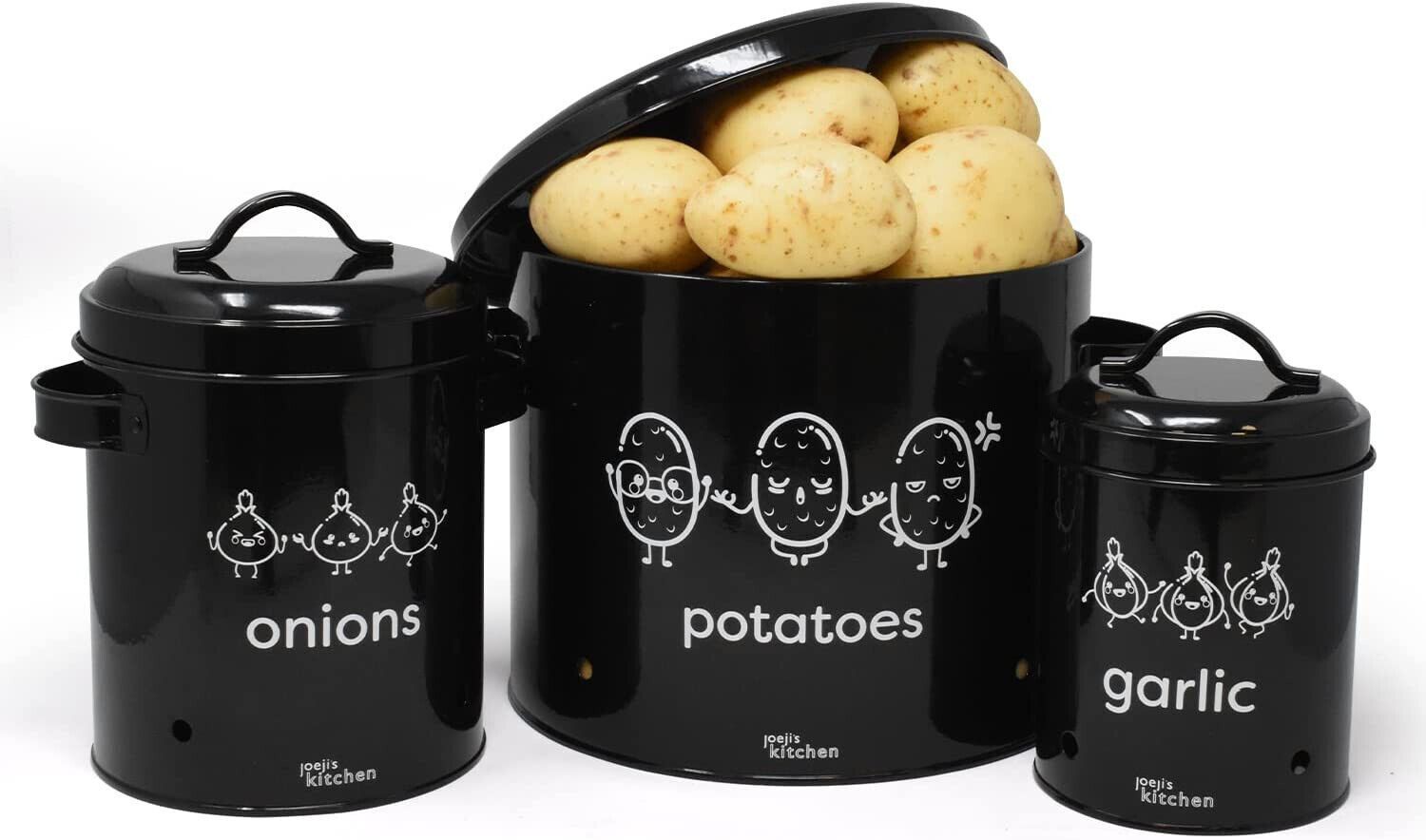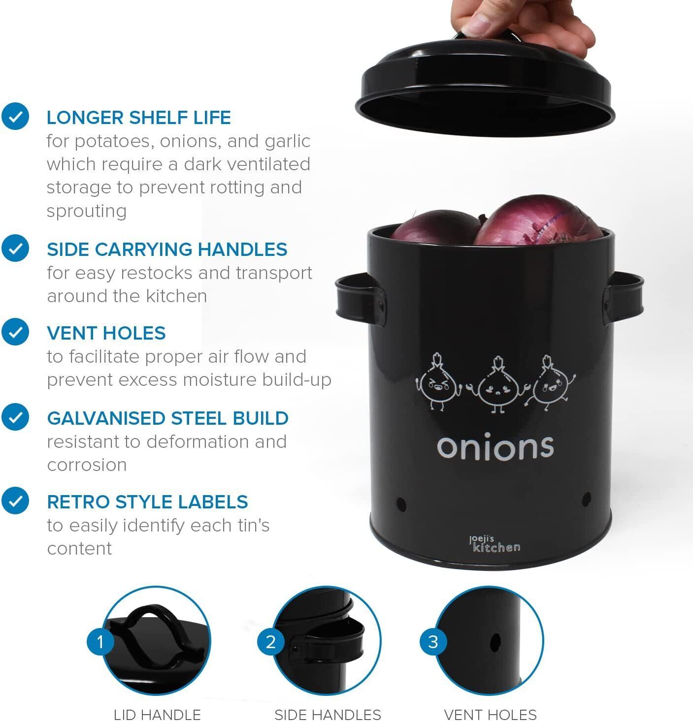 EuroEuroJoejis 3er Set Kartoffel Zwiebel Knoblauch Aufbewahrungsbox -Großer Vorratsbehälter aus Metall - Stylischer Retro-Look - Zwiebeltopf Kartoffeltopf Knoblauchtopf Ideale Aufbewahrung Zwiebeln - Unsere Aufbewahrung Kartoffeln Zwiebeln Knoblauch bietet einen dunklen und gut belüfteten Bereich. I