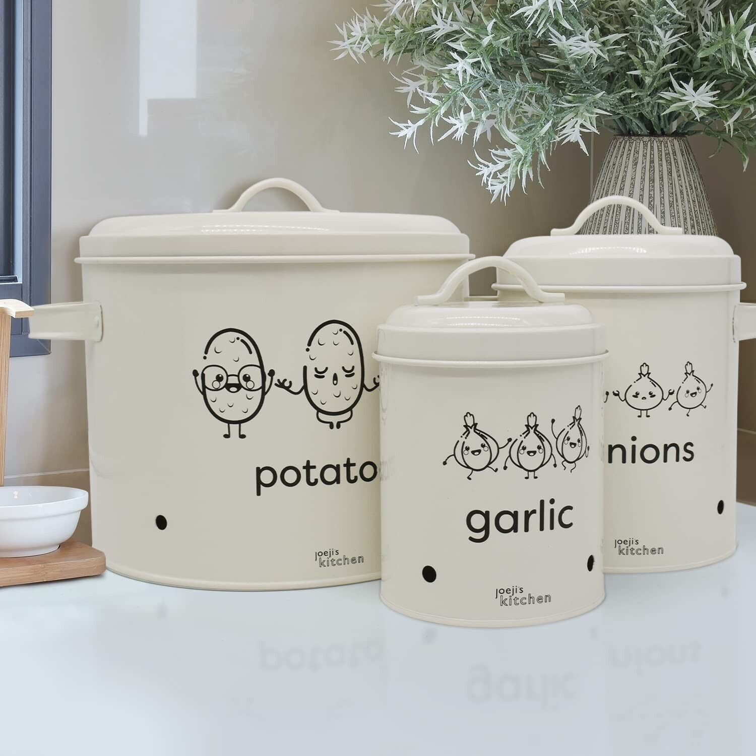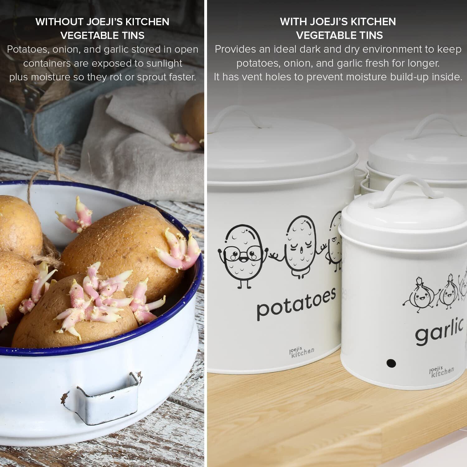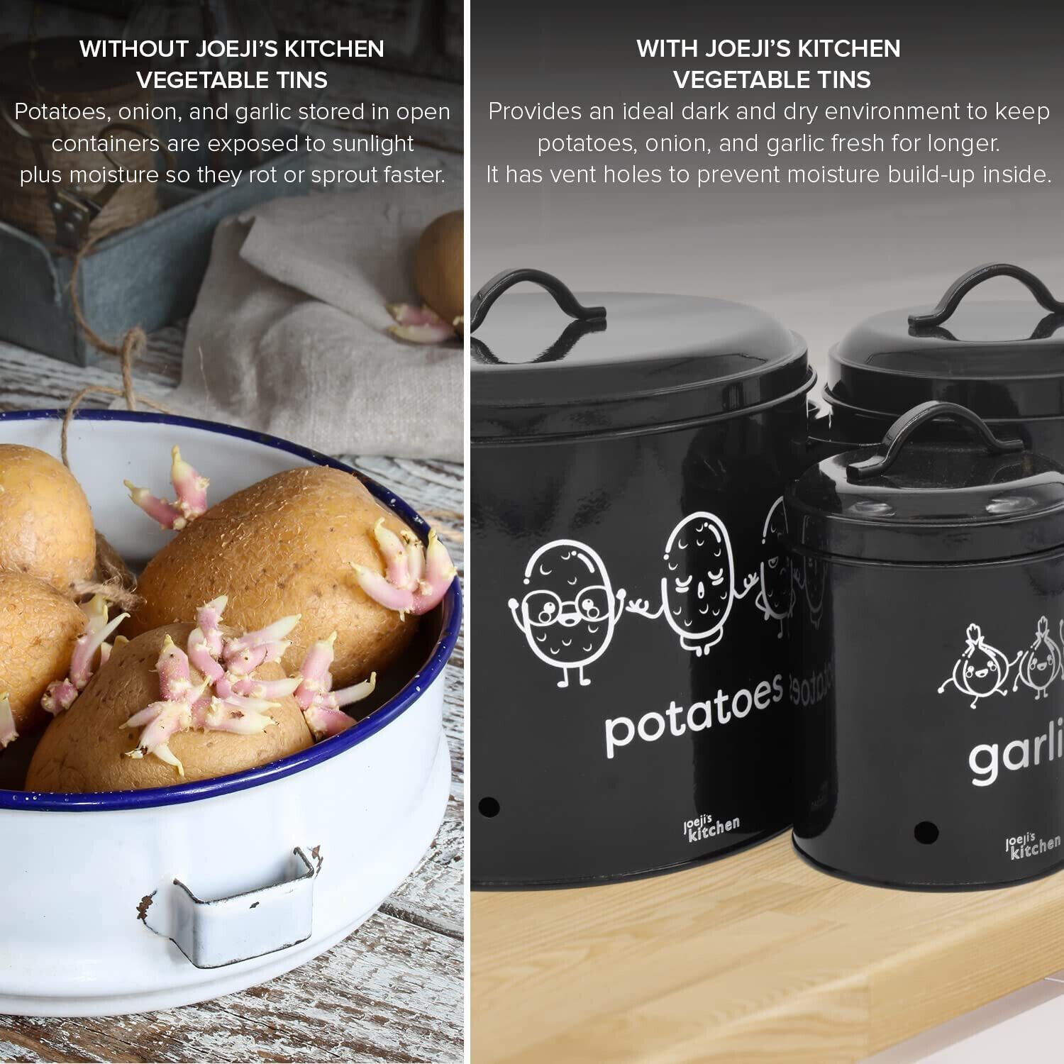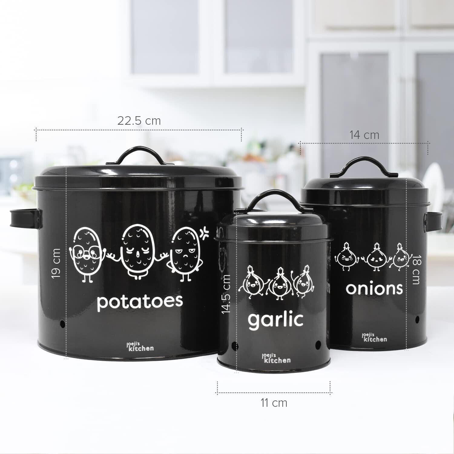 EuroEuroJoejis 3er Set Kartoffel Zwiebel Knoblauch Aufbewahrungsbox -Großer Vorratsbehälter aus Metall - Stylischer Retro-Look - Zwiebeltopf Kartoffeltopf Knoblauchtopf Ideale Aufbewahrung Zwiebeln - Unsere Aufbewahrung Kartoffeln Zwiebeln Knoblauch bietet einen dunklen und gut belüfteten Bereich. I