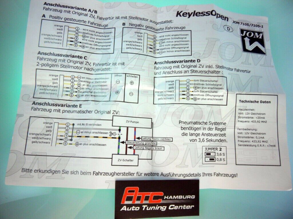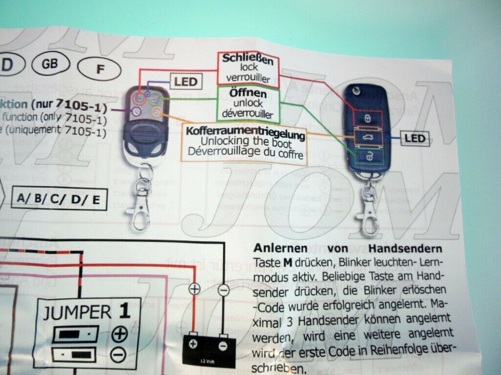 Artikelbezeichnung 1 Stück universal JOM Funkfernbedienung mit 2 Schlüsselhandsender für Fahrzeuge mit Zentralverriegelung • für viele VW Modelle mit einer Zentralverriegelung - ohne Serienfernbedienung • 2 Schlüssel-Funkhandsender • 2 Schlüsselrohlinge, bei Bestellung bitte mit anführen welche es s
