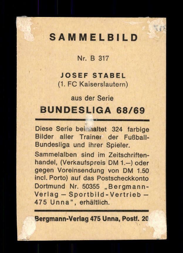 Josef Stabel 1 FC Kaiserslautern Bergmann Sammelbild 1968-69 Original Signiert